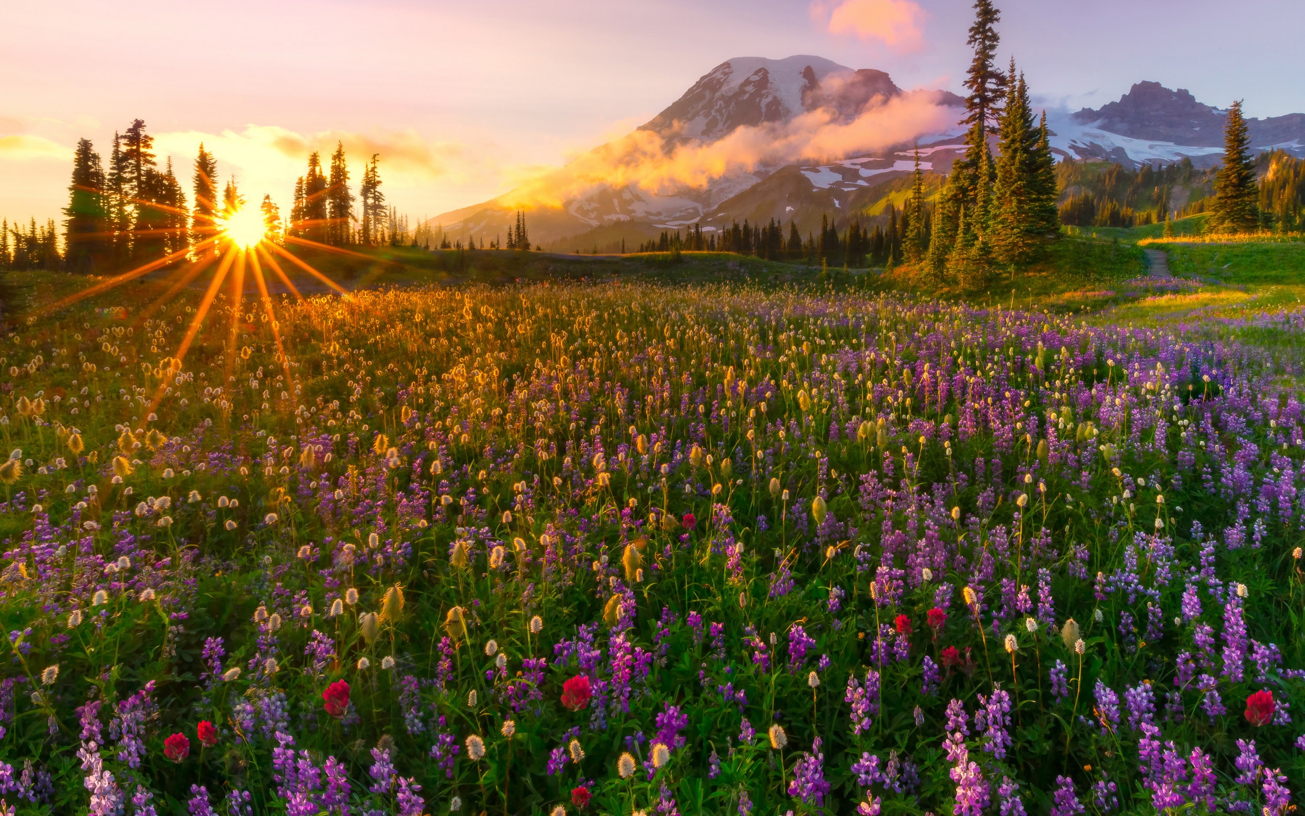 Description: A field of wildflowers with a mountain in the background at sunset with the sun shining through the clouds.