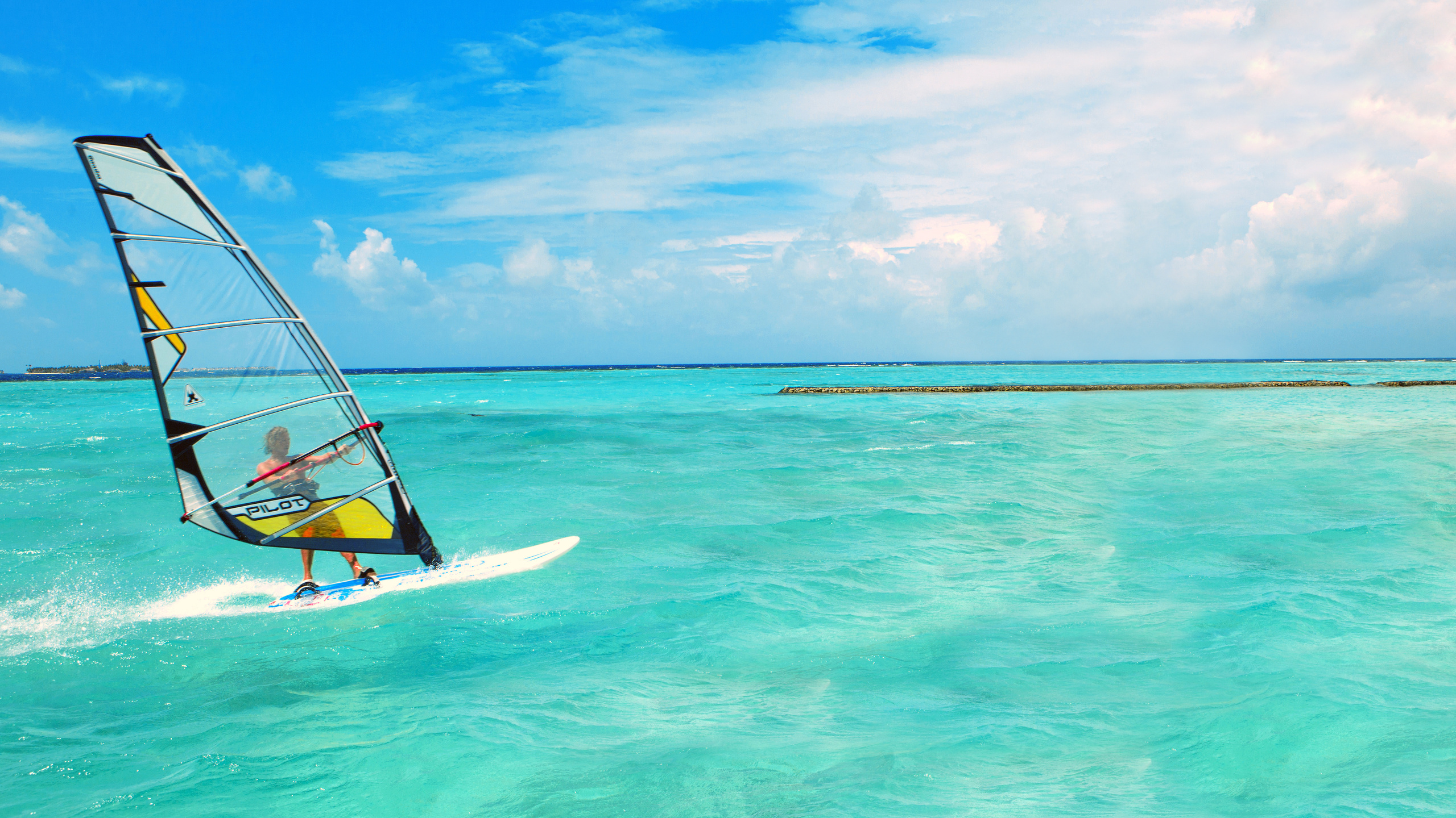 Description: A man riding a wind sail on top of a body of water with a sailboard in the air.