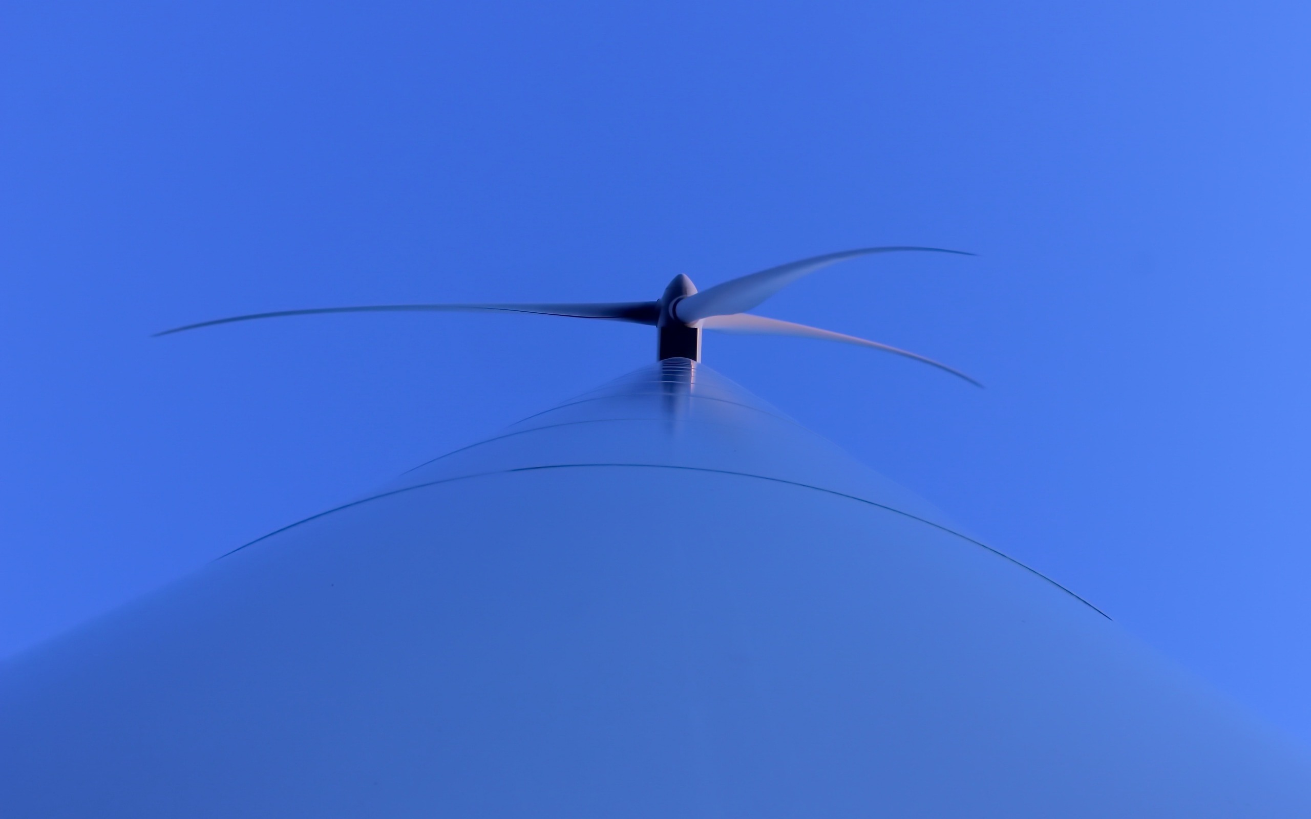 Description: A wind turbine with a blue sky in the background and a bird flying by it's side.