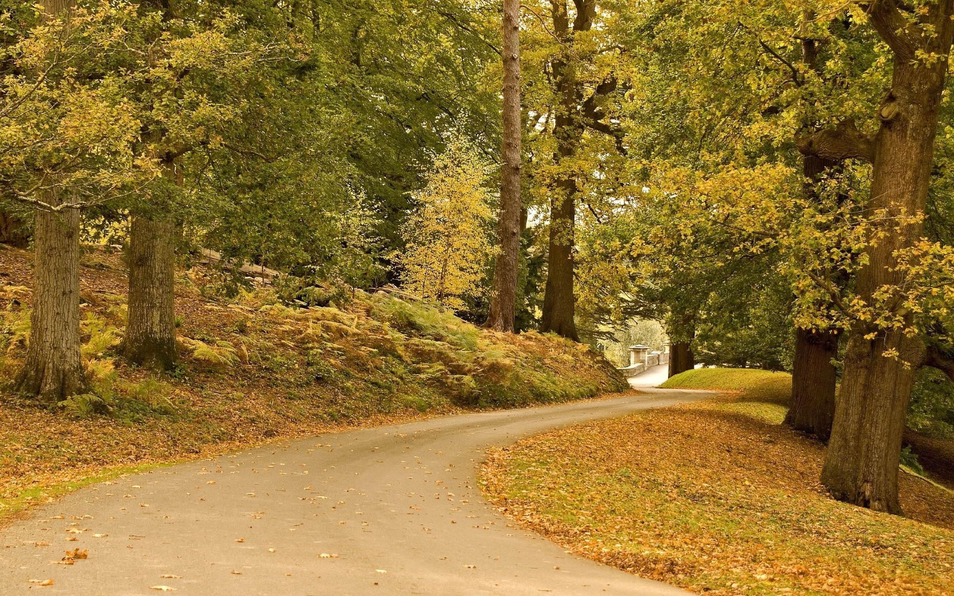 Description: A road in the middle of a forest with trees lining the sides of it and a winding road in the middle of the woods.