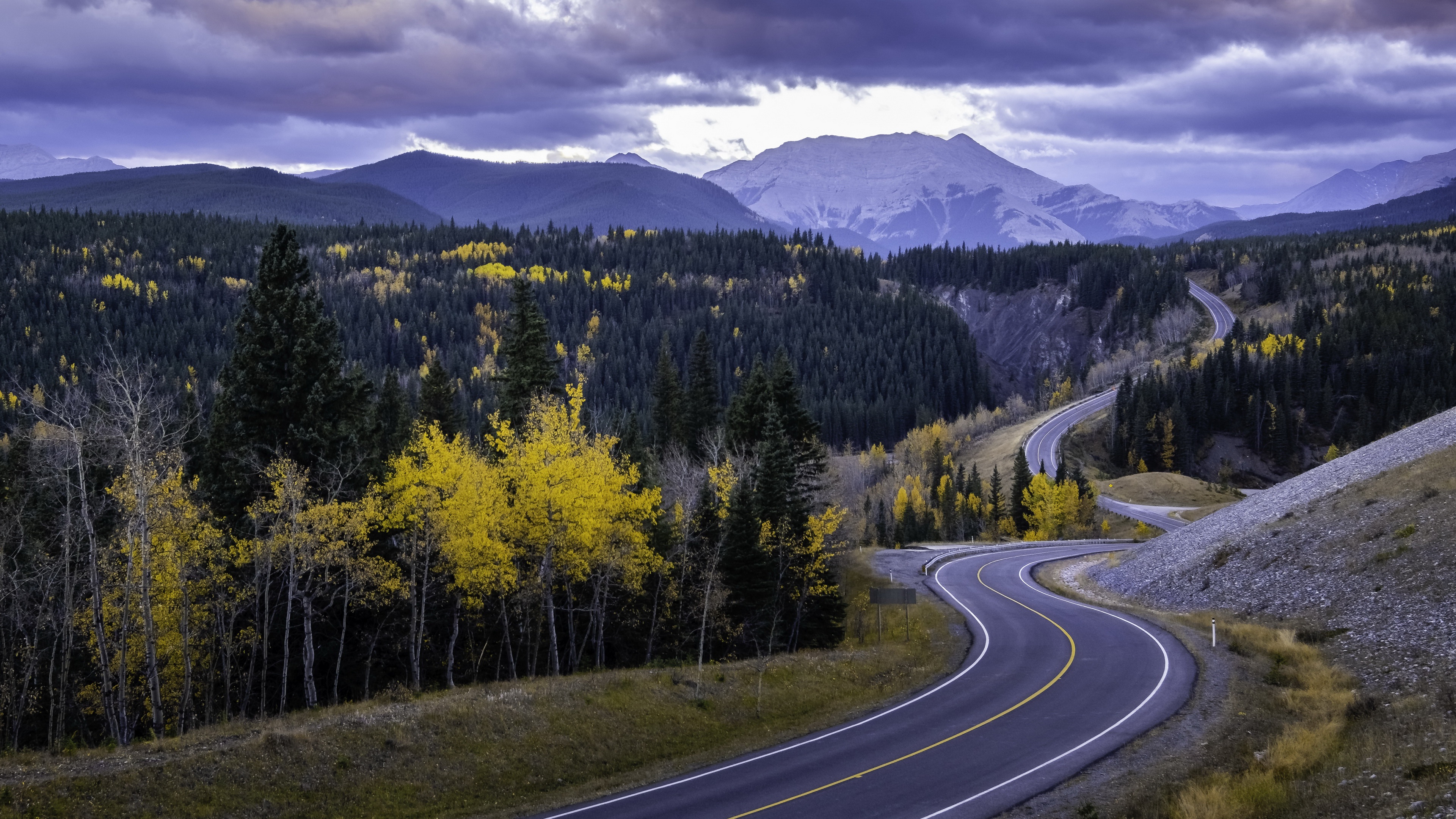 Description: A road winding through a forest with mountains in the background and clouds in the sky above it.