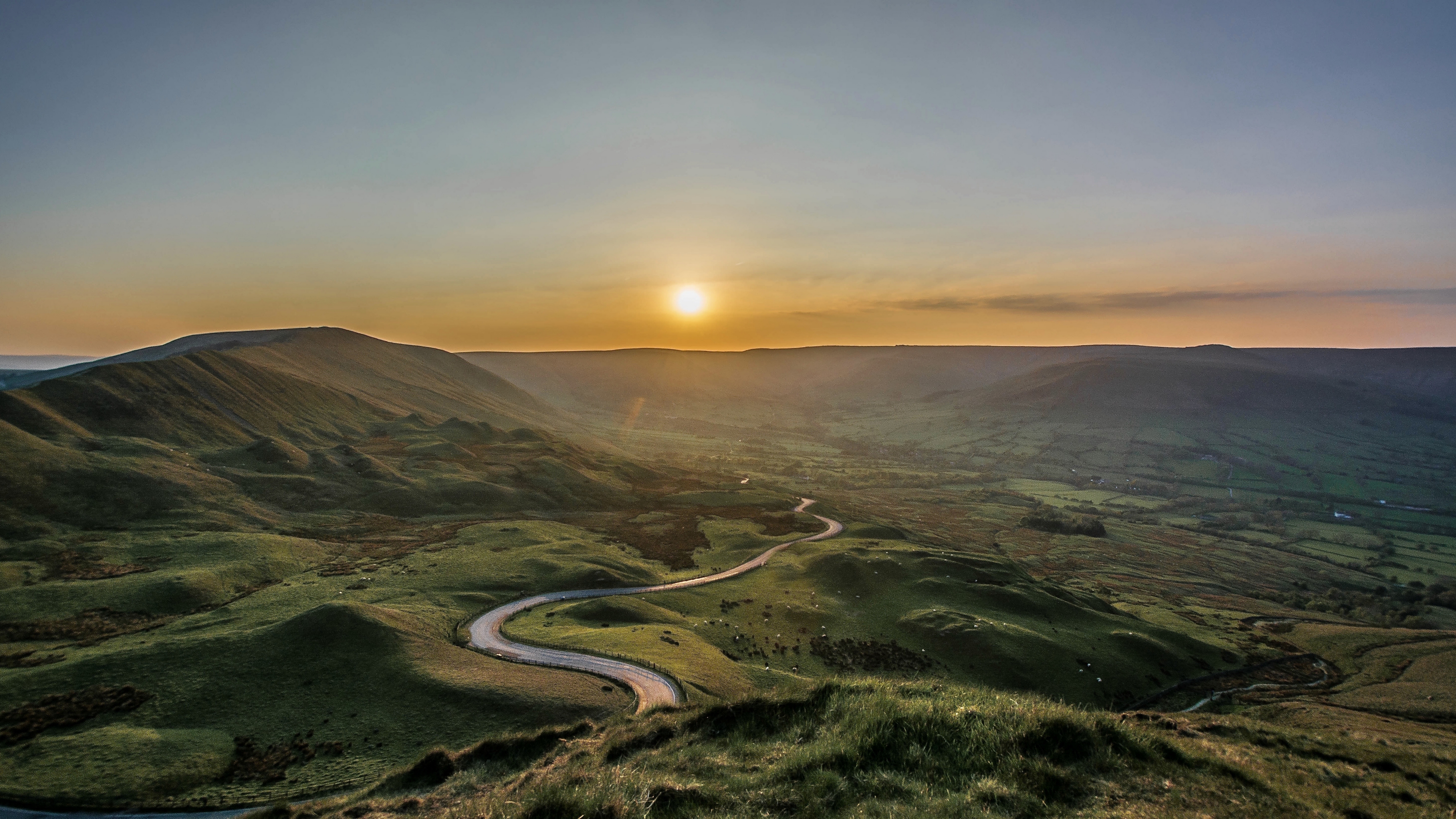Description: A winding road winding through a lush green valley at sunset with the sun setting in the distance over the hills.