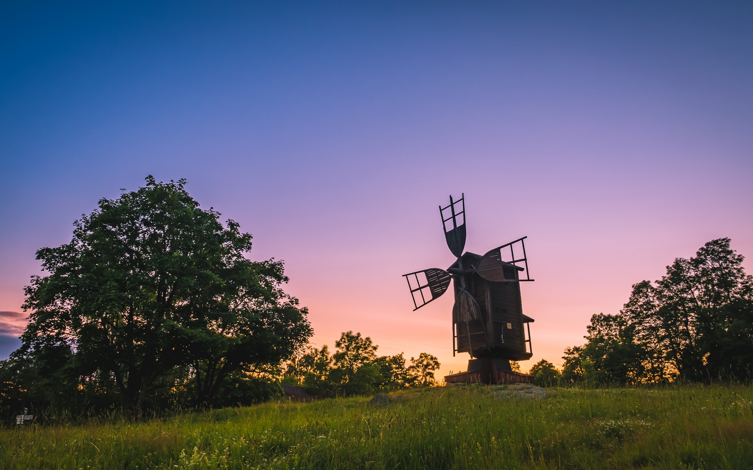 Description: A windmill in a field with trees in the background at sunset or dawn with a purple sky behind it.