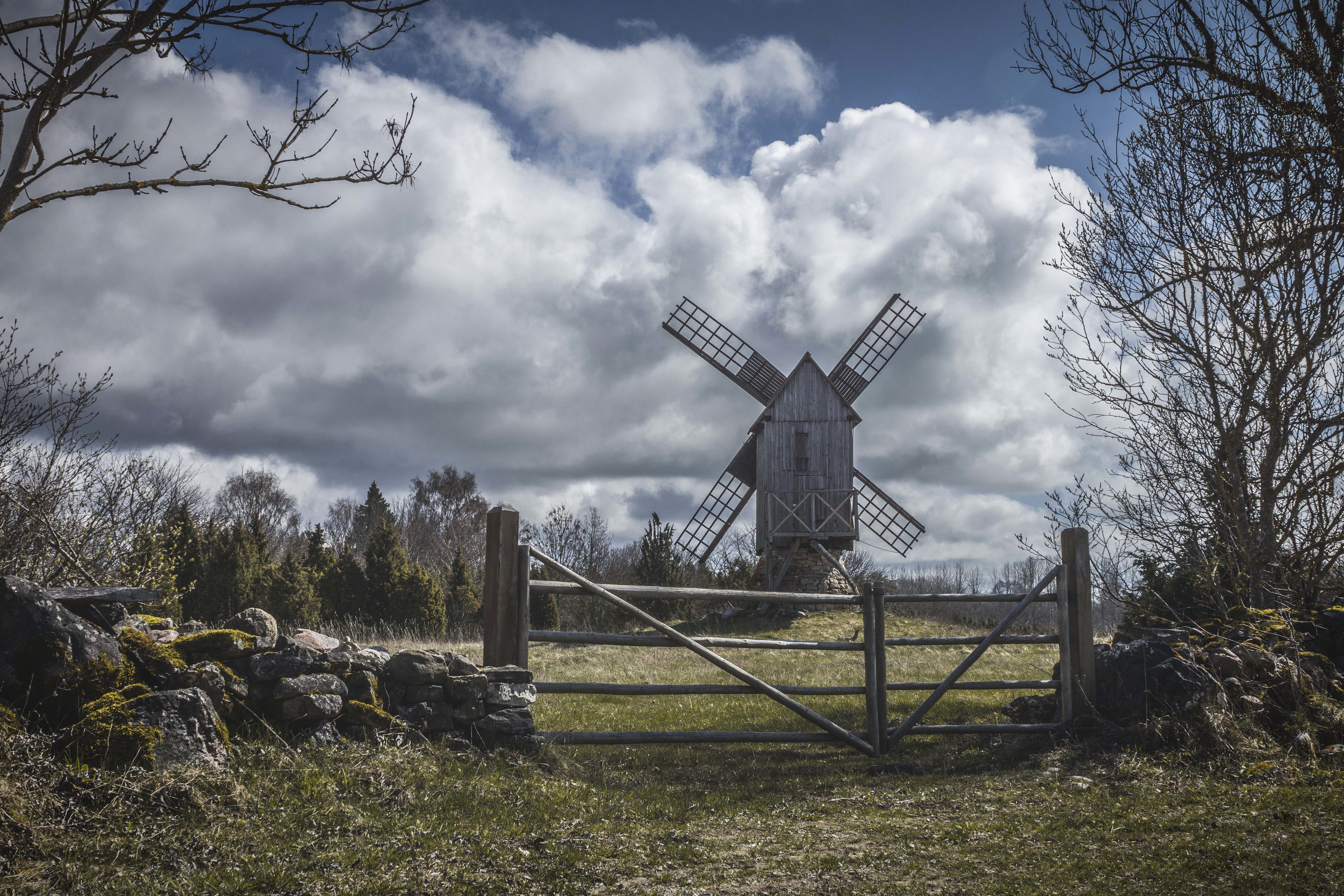 Description: A windmill is seen through a gate in a field with trees and rocks in the background.