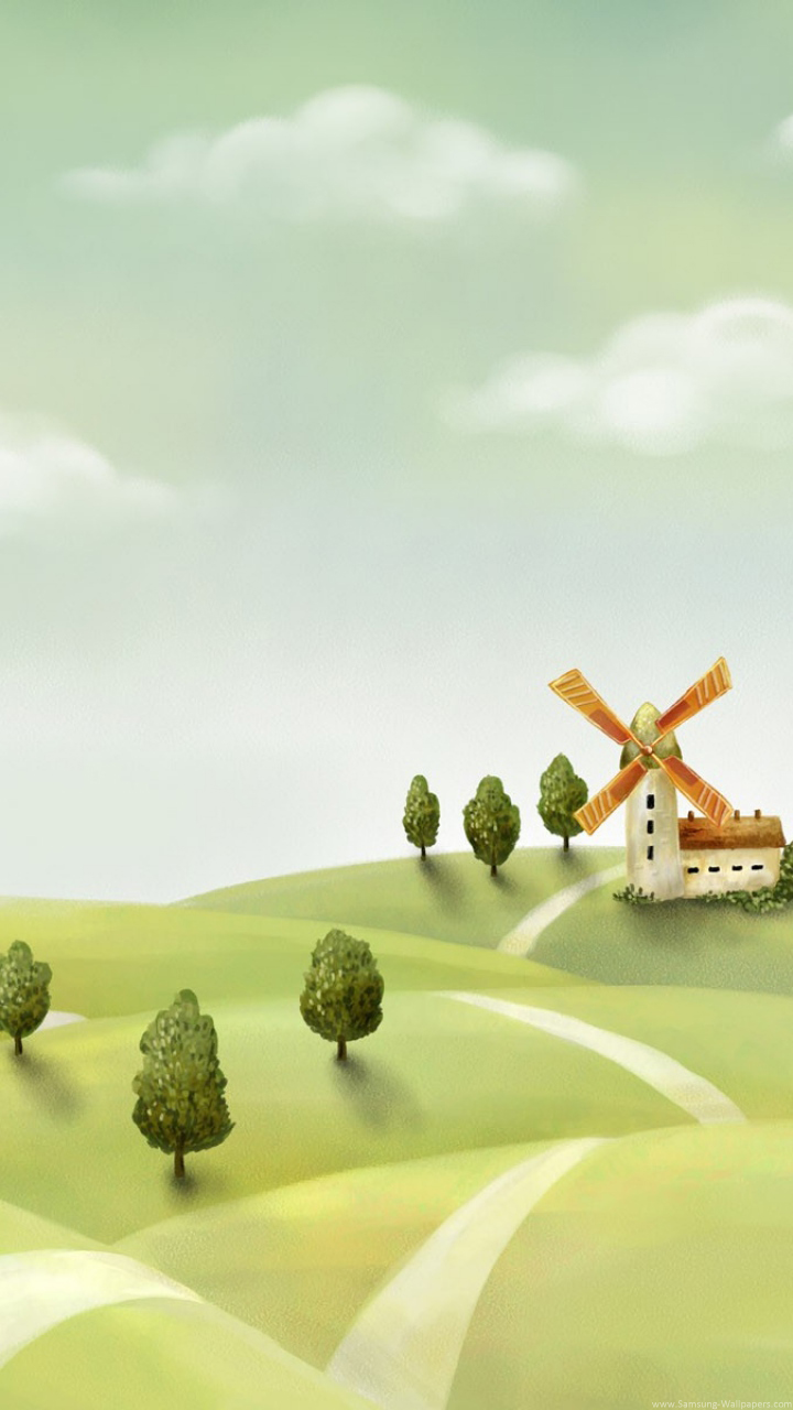 Description: A painting of a windmill in a green field with trees and a road leading to it and a house.