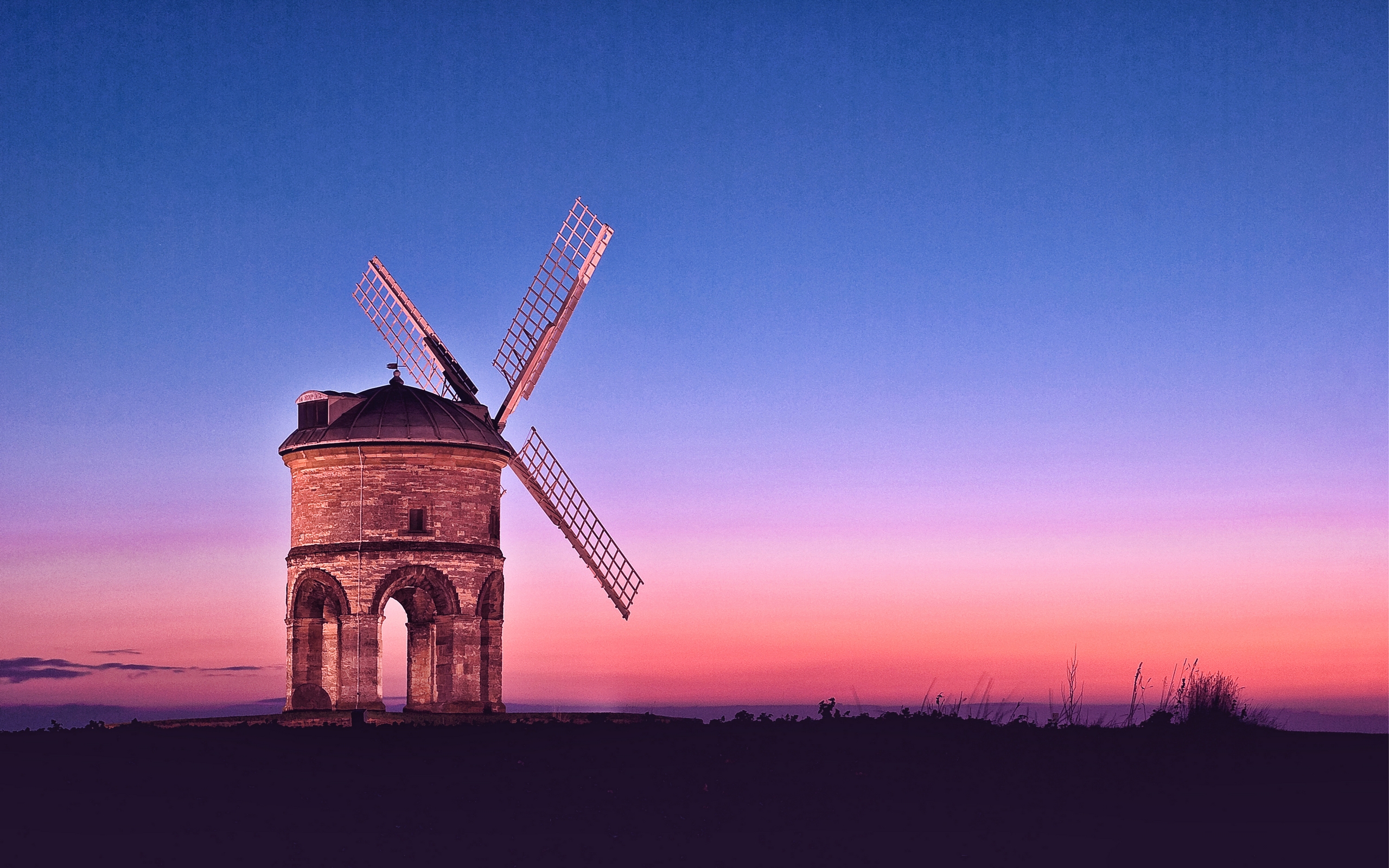 Description: A windmill on a hill with a purple sky in the background at sunset or dawn with a pink and blue sky.