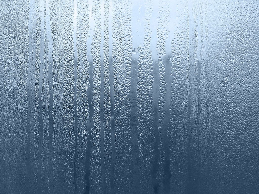 Description: A window with condensation on it and a sky background with clouds in the background and a line of rain drops.