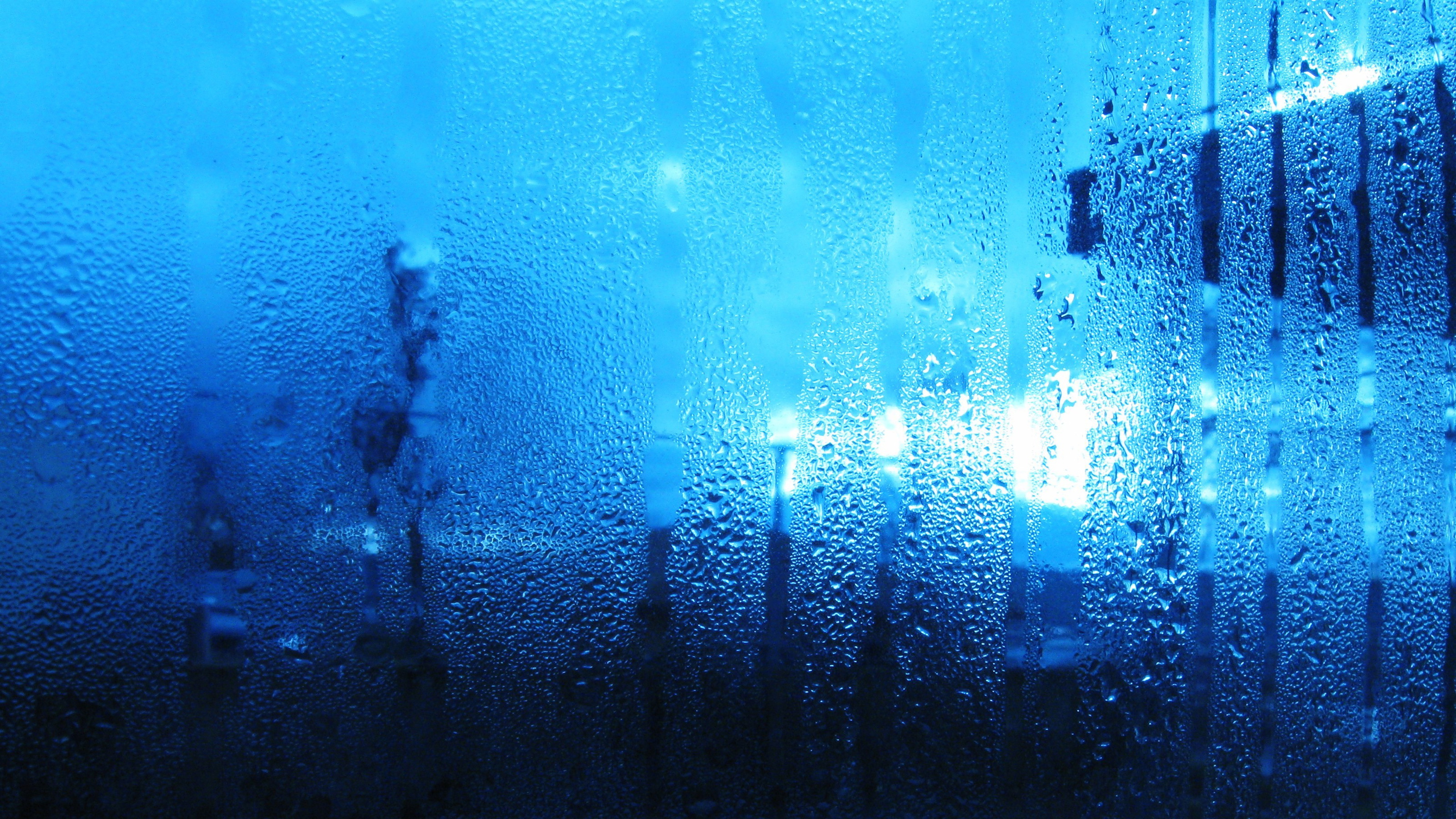 Description: A window with rain drops on it and a building in the background with a blue light shining through the window.