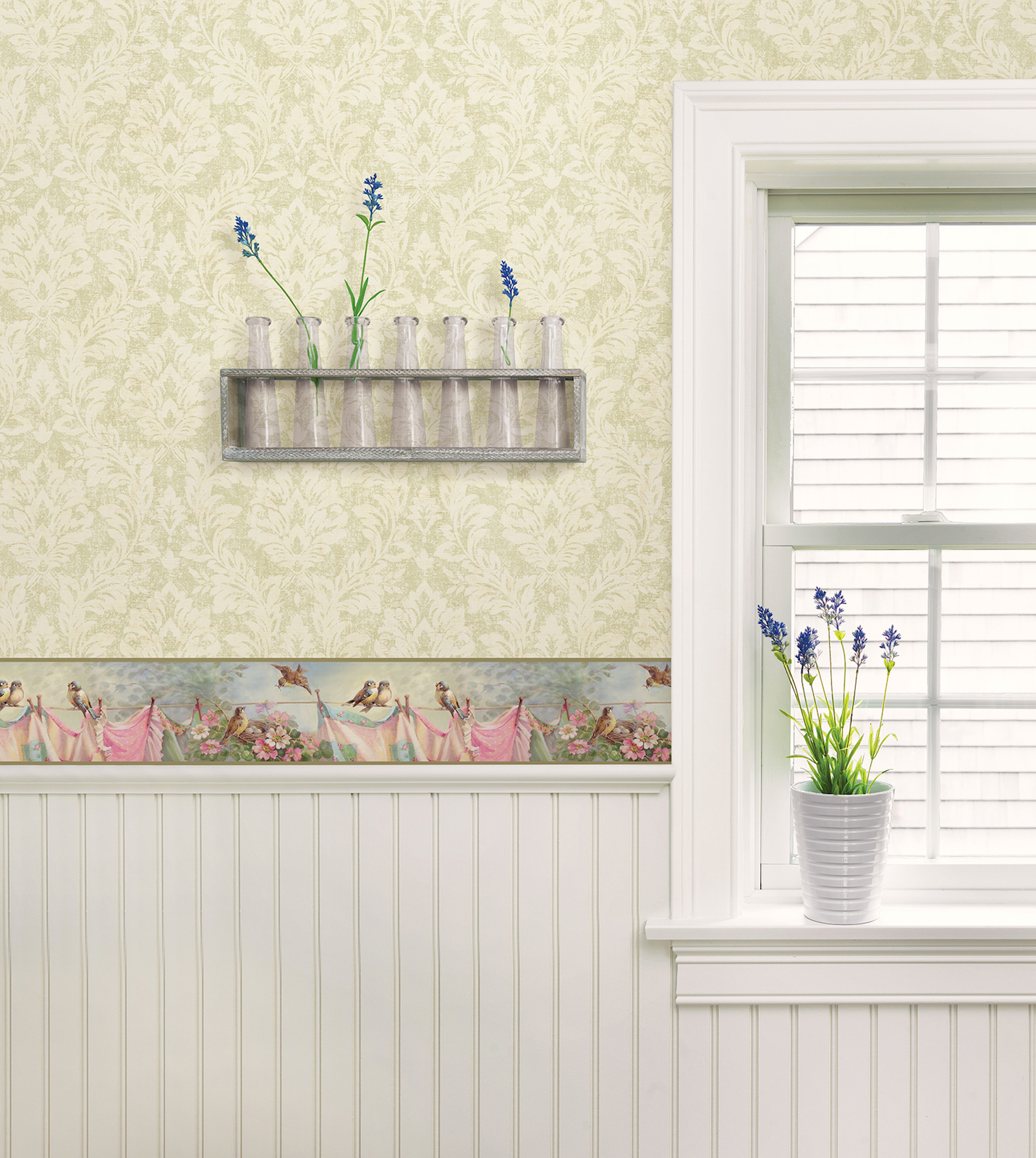 Description: A window sill with a flower pot and a vase with flowers on it next to a window sill.