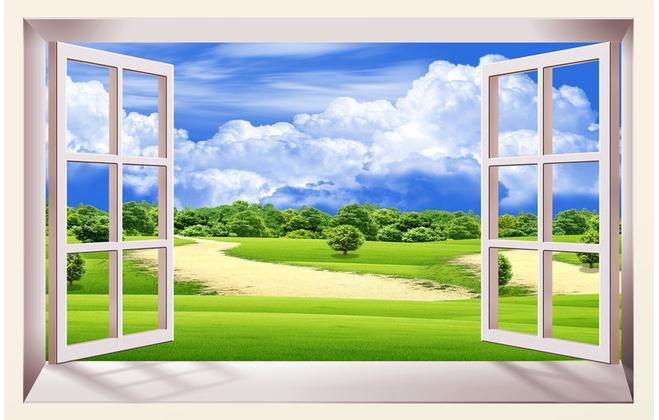 Description: A window with a view of a green field and a blue sky with clouds in it and a green field with trees.