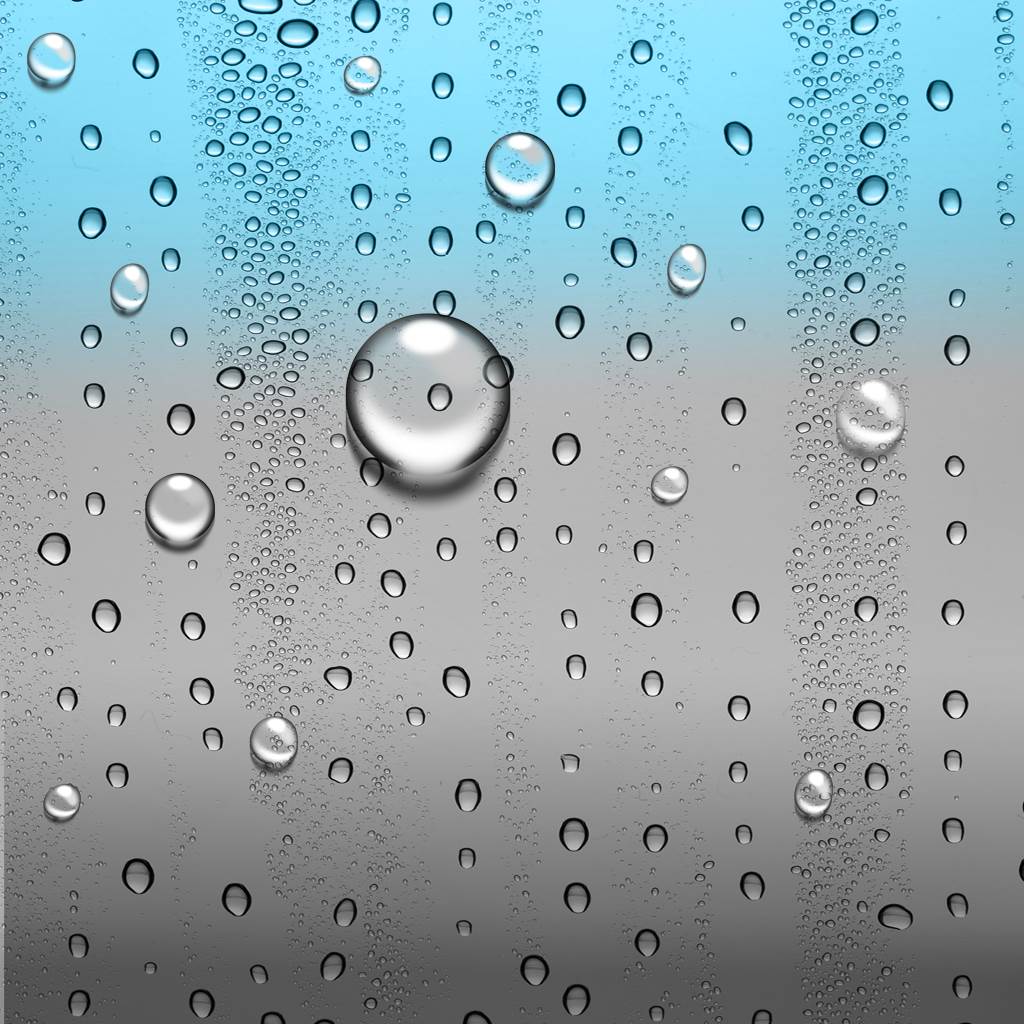 Description: A close up of a window with water drops on it and a blue sky in the background with a white border.