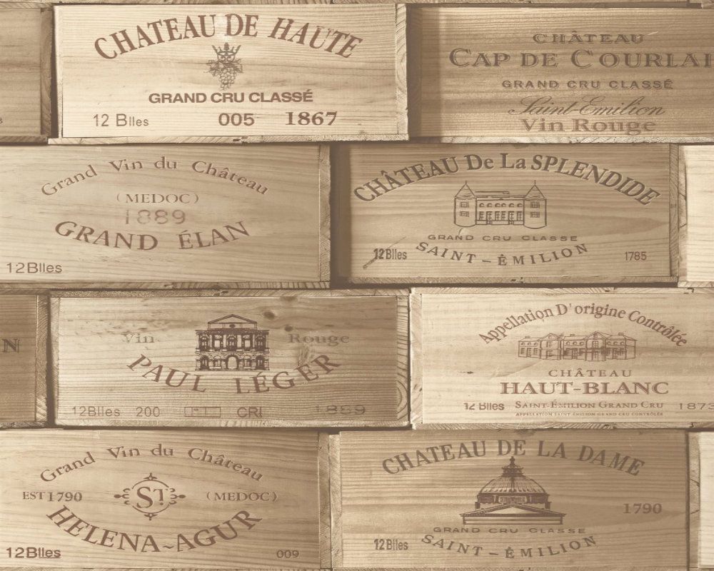 Description: A wall of wine bottles with labels on them in a wine cellar wallpaper pattern in beige and white.