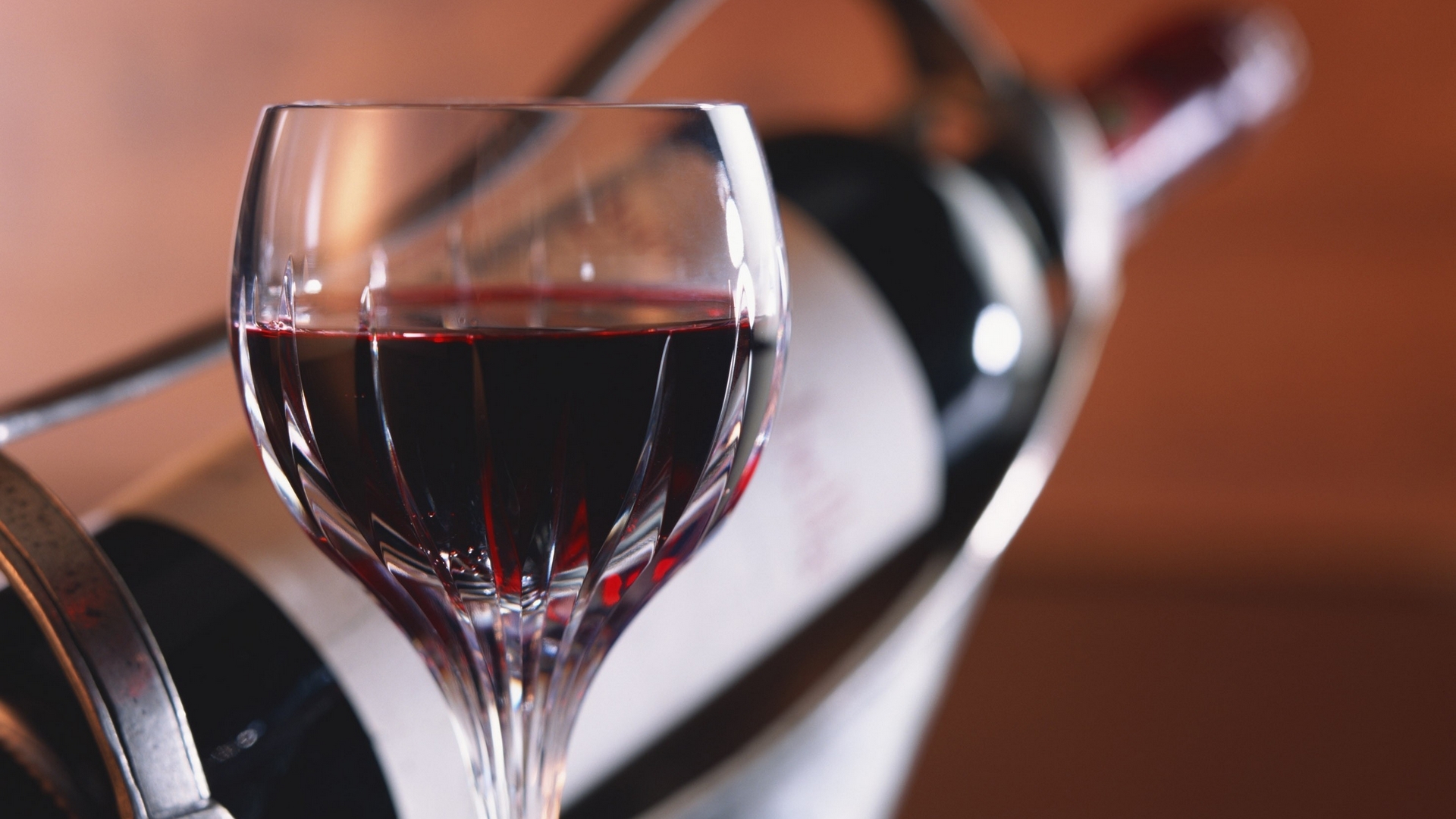 Description: A glass of wine sitting next to a bottle of wine on a table top with a wine bottle in the background.