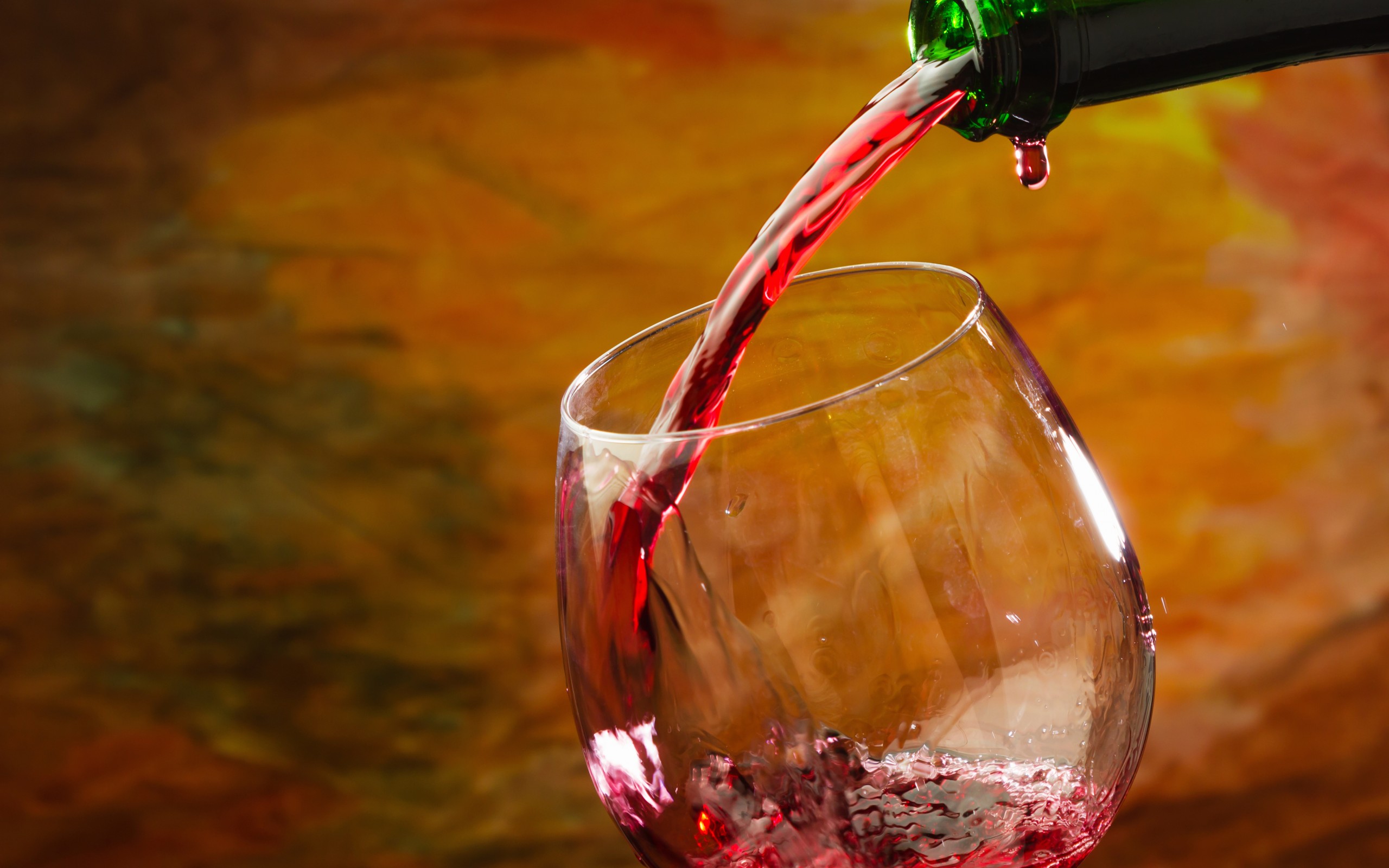 Description: A wine glass filled with red wine being poured into it with a bottle of wine in the background and a painting of leaves.