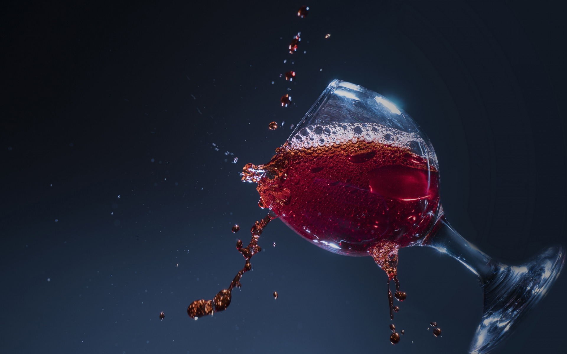Description: A glass of wine is being poured into it with a splash of water on the glass and a blue background.