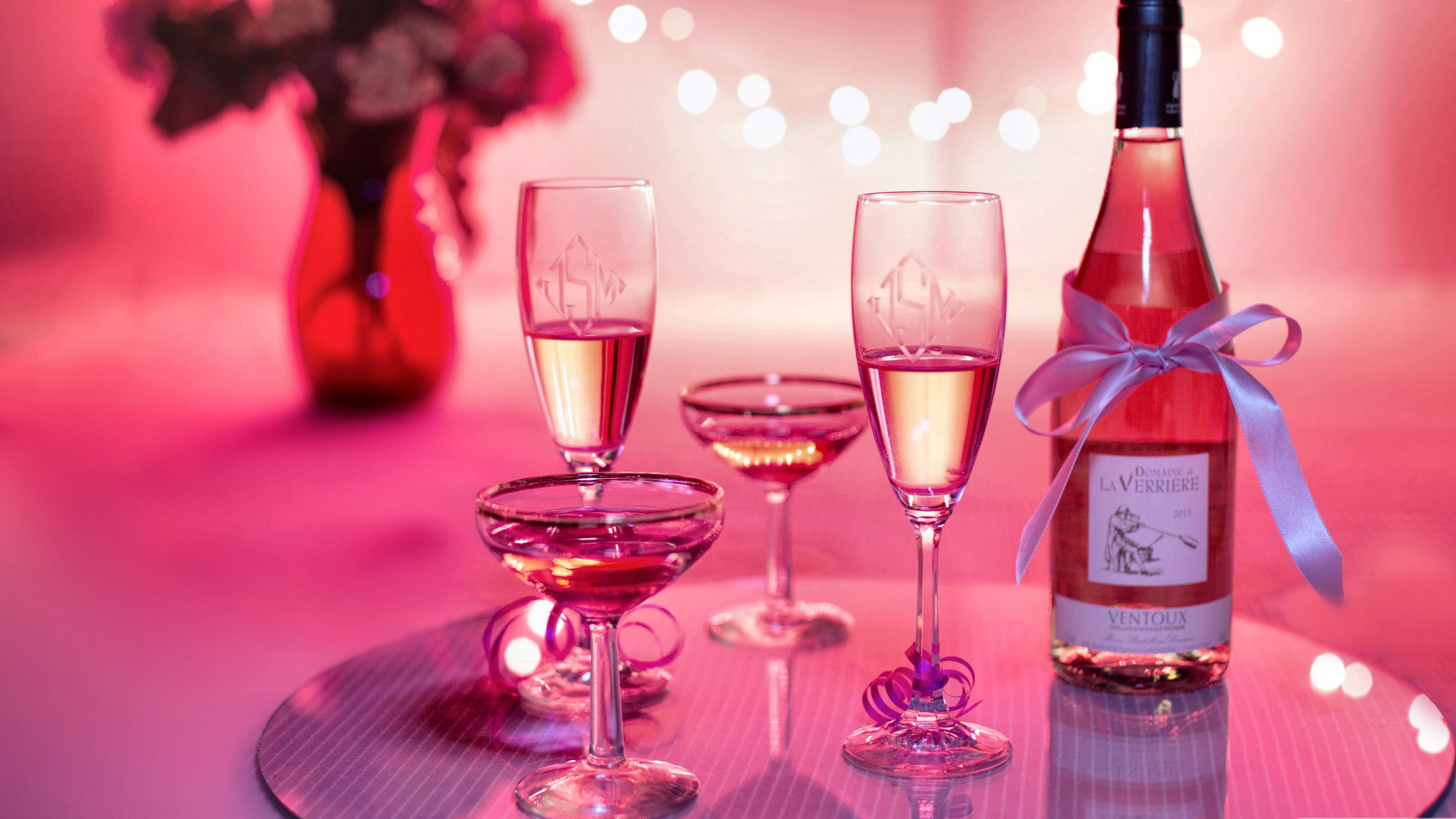 Description: A table with three wine glasses and a bottle of wine on it with a pink background and a vase with flowers.