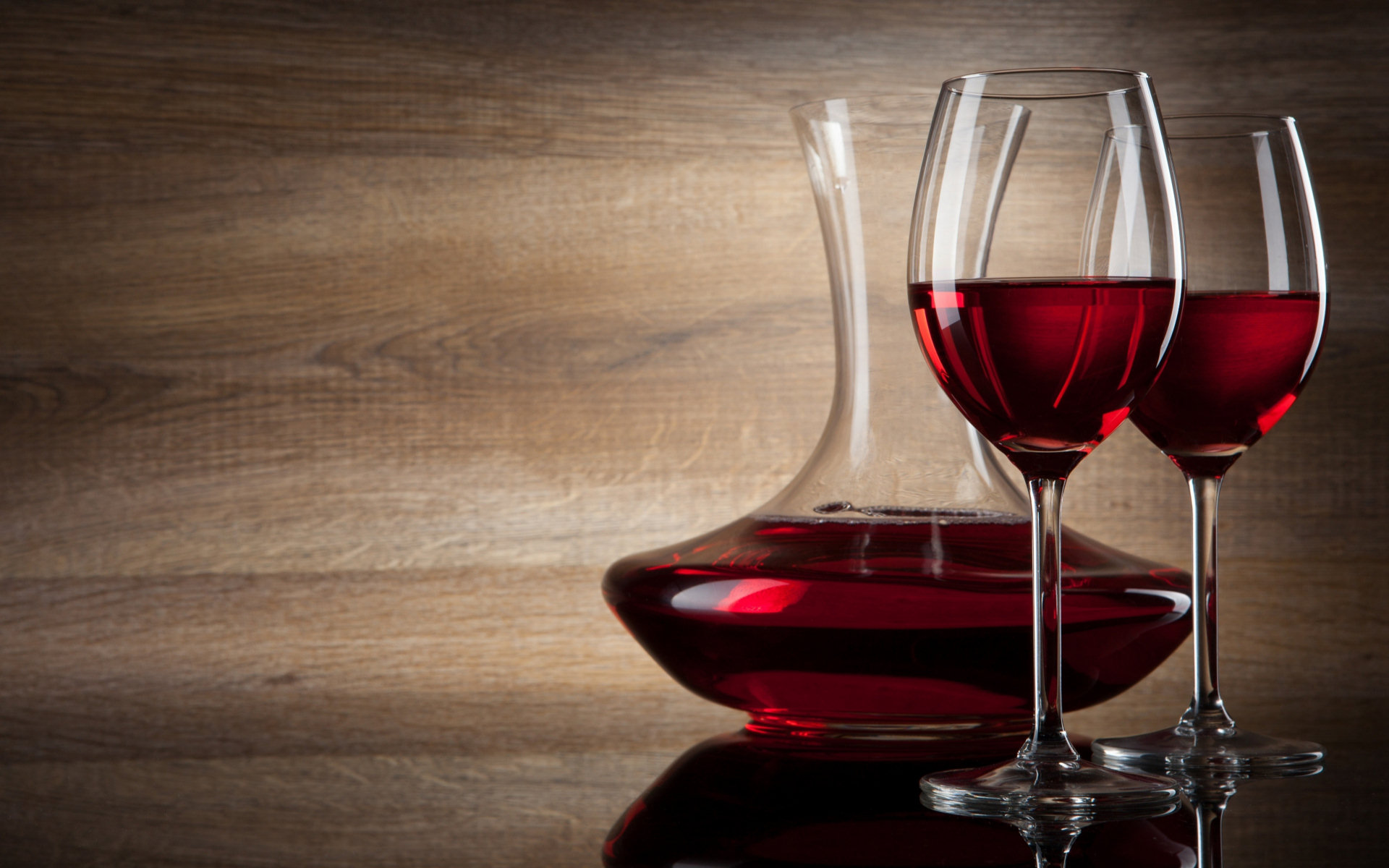 Description: Two wine glasses and a decanter on a table with a wood background and a wooden wall behind them.