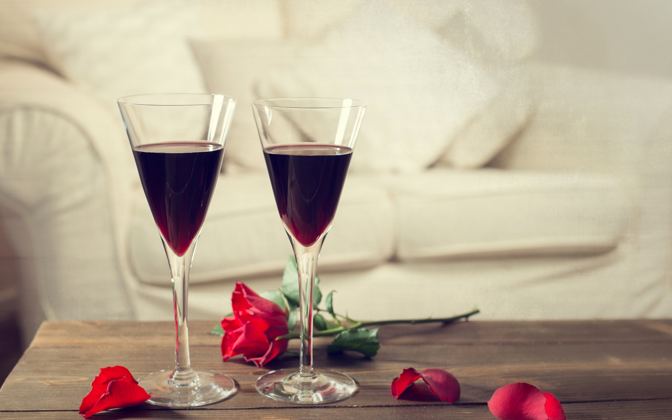 Description: Two glasses of wine on a table with roses on the table and a couch in the background with a white couch.