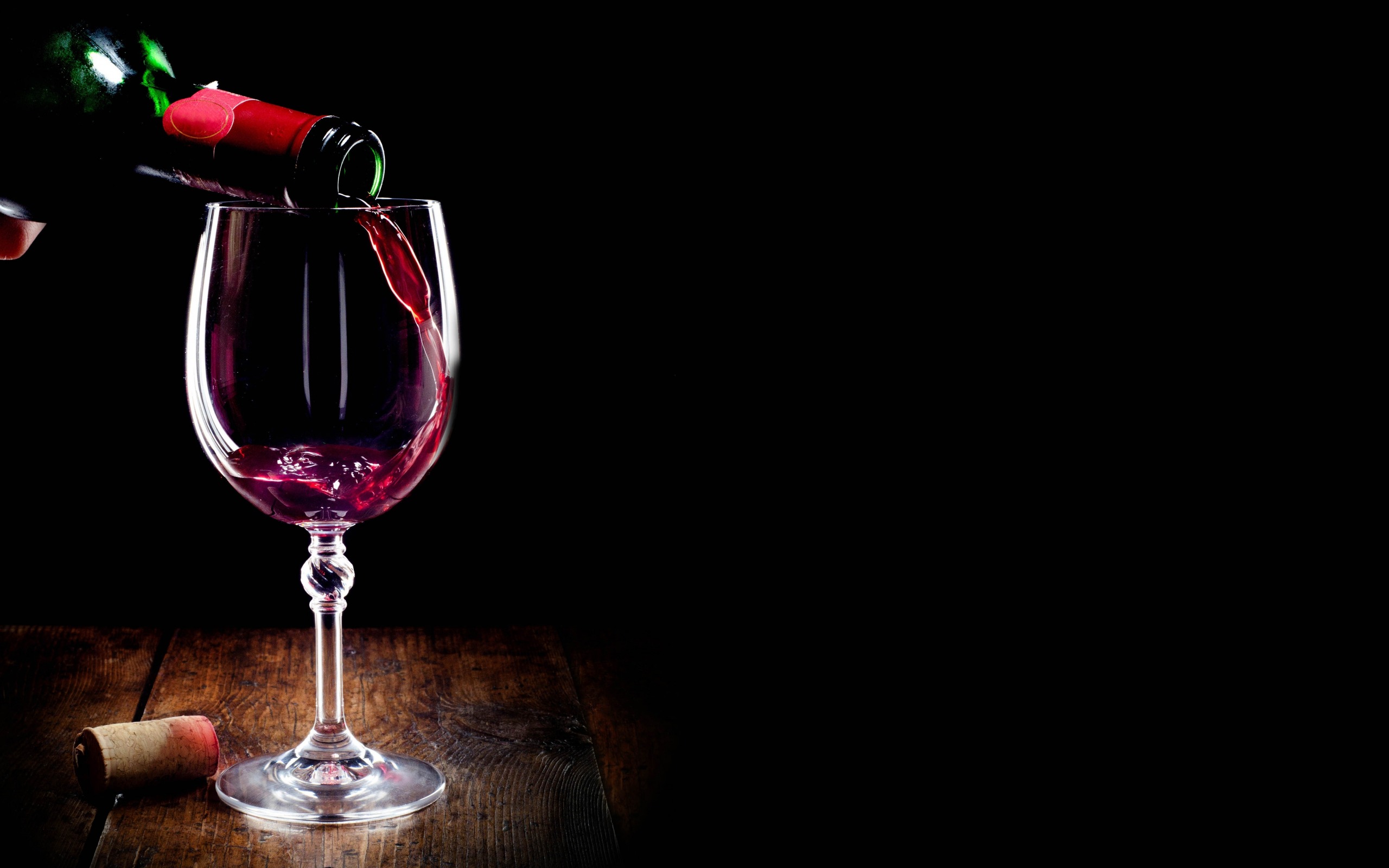 Description: A glass of wine being poured into a wine glass with a cork in it on a wooden table with a bottle of wine.