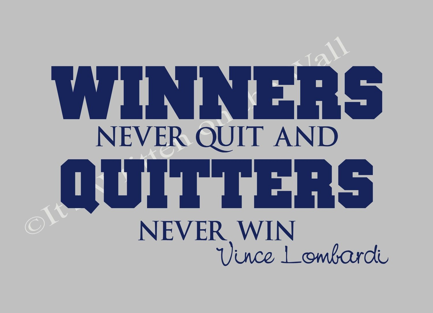 Description: A quote that reads winners never out and quitters never win twice lemonardi on a gray background.