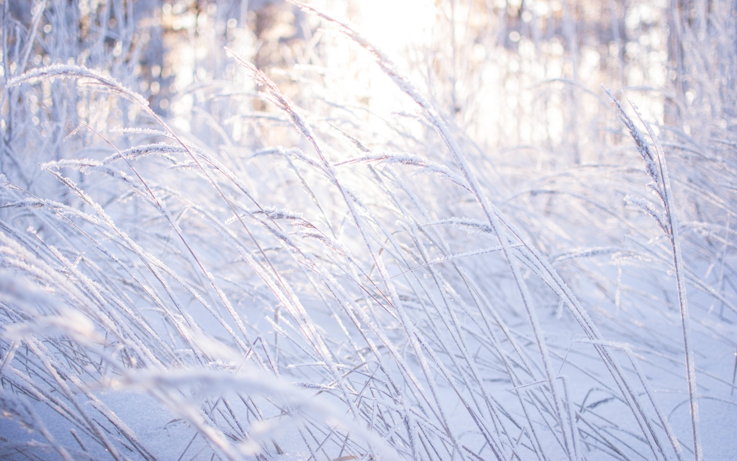 Description: A bunch of tall grass that are in the snow with snow on them and some grass in the foreground.