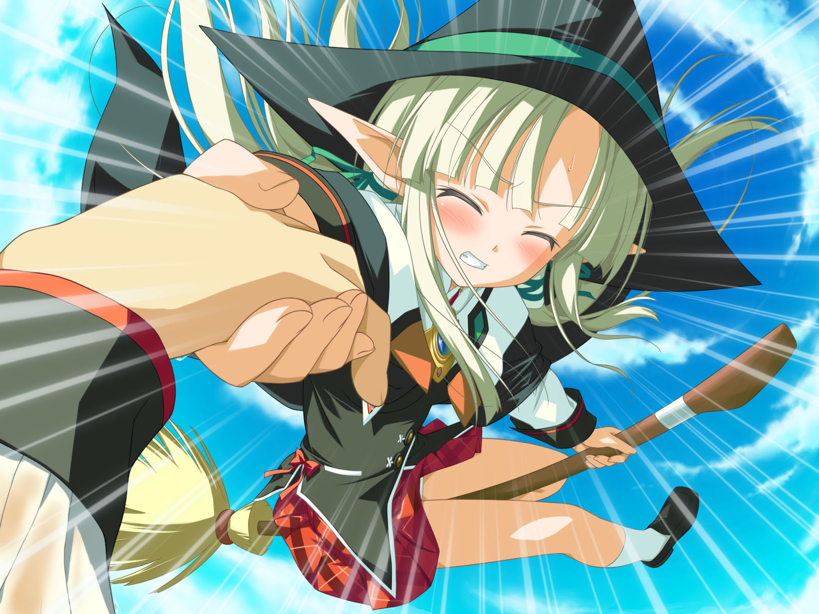 Description: A woman flying through the air while holding a broom in her hand and wearing a witches hat and holding a broom.