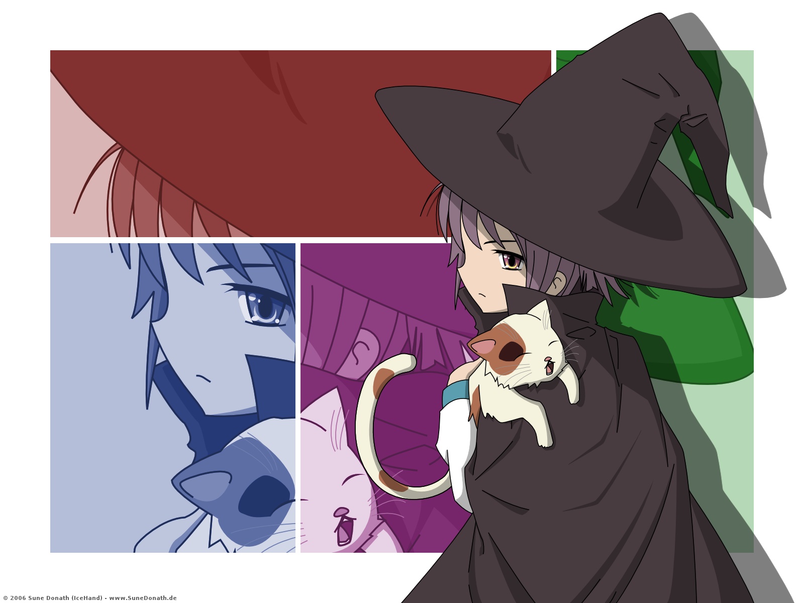 Description: A woman in a witches costume holding a cat and a dog in her arms with a hat on her head.