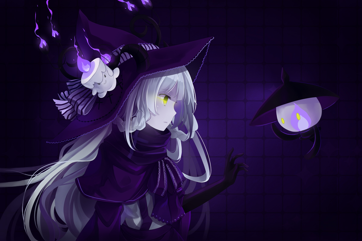 Description: A woman dressed in a witch costume holding a lamp and a cat on her head with a purple background.