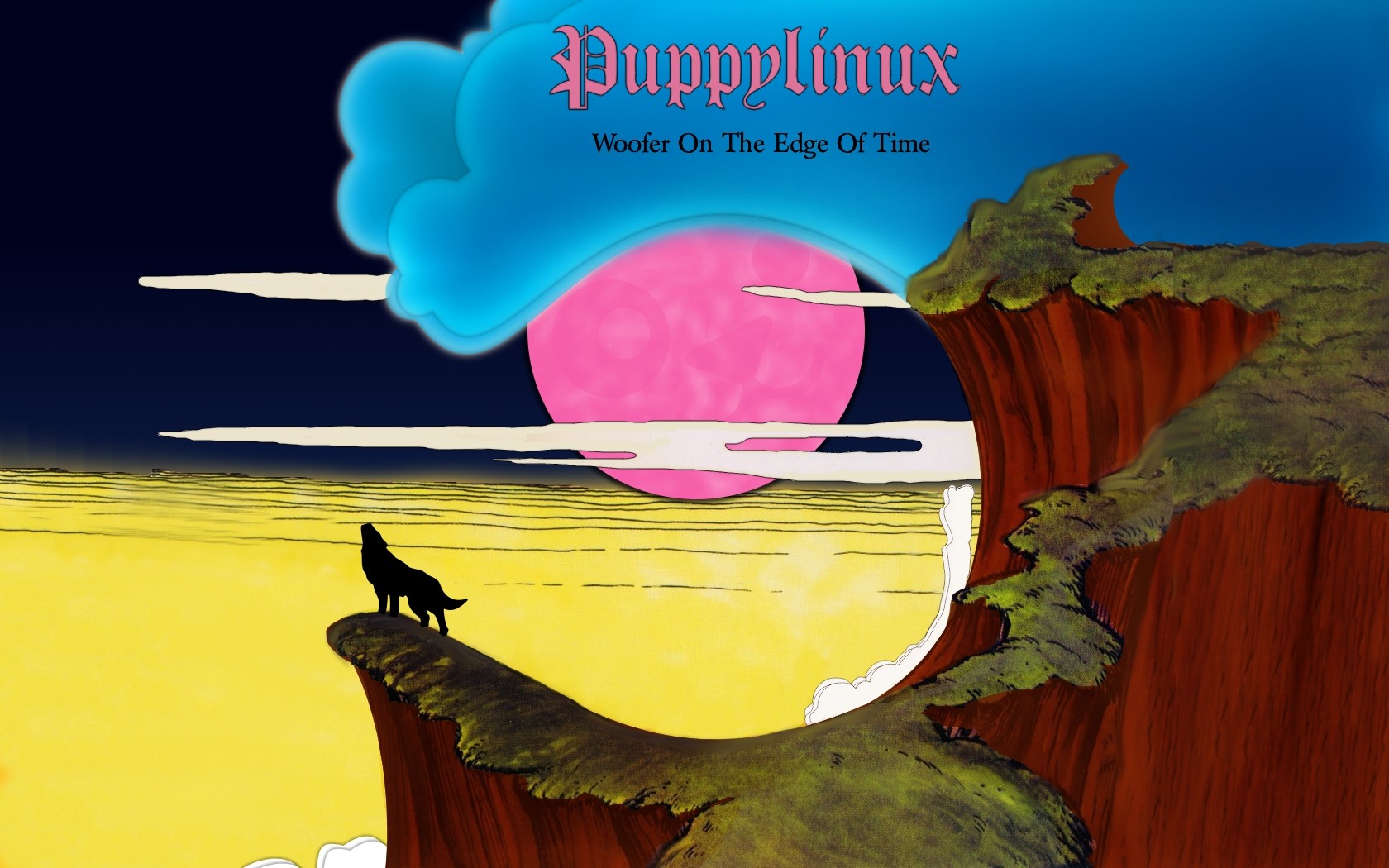 Description: A wolf standing on a cliff with a pink ball in the sky above it and a pink ball in the sky above it.