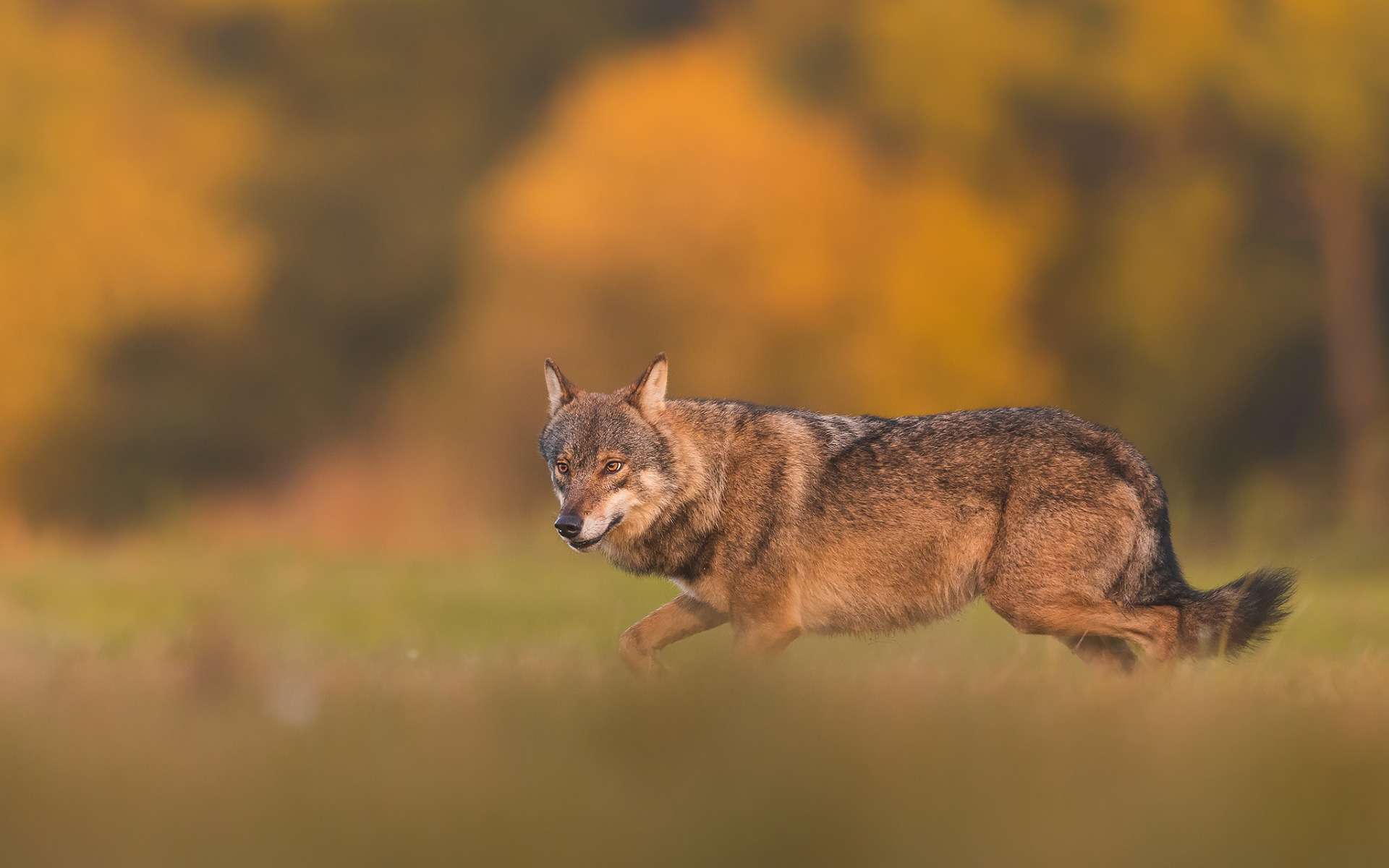 Description: A wolf running through a field of grass with trees in the background and a yellow sky in the background.