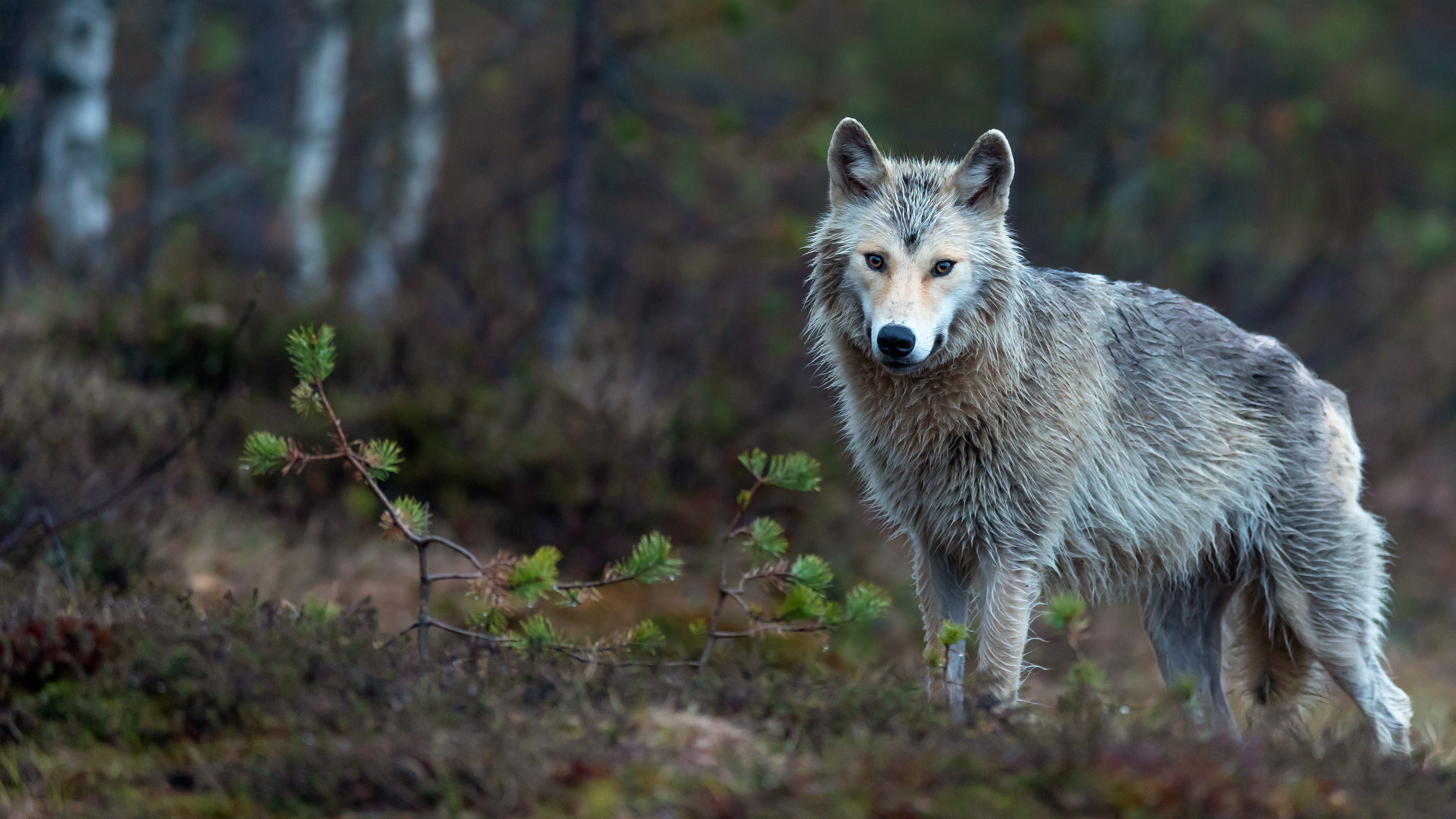 Description: A wolf standing in a forest looking at the camera with a blurry background of trees and bushes behind it.