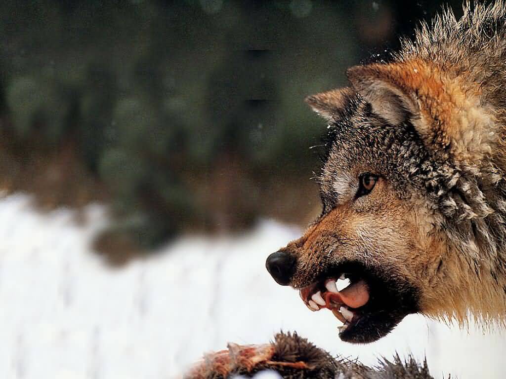 Description: A wolf is growling at something in the snow outside in the winter time.