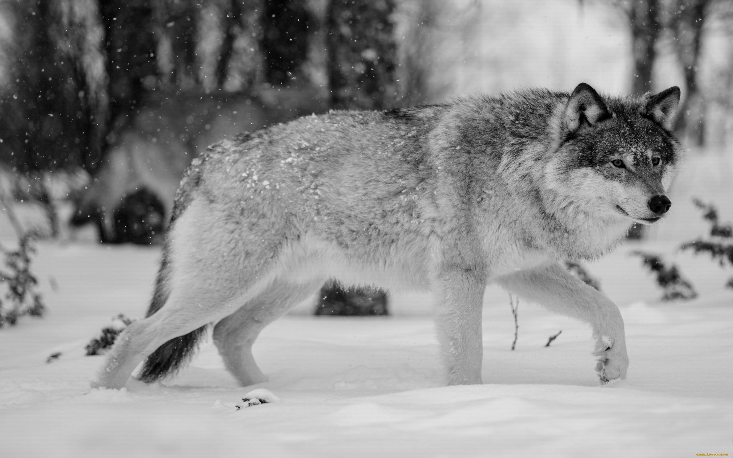 Description: A wolf walking through the snow in a forest with trees in the background and snow falling on the ground.