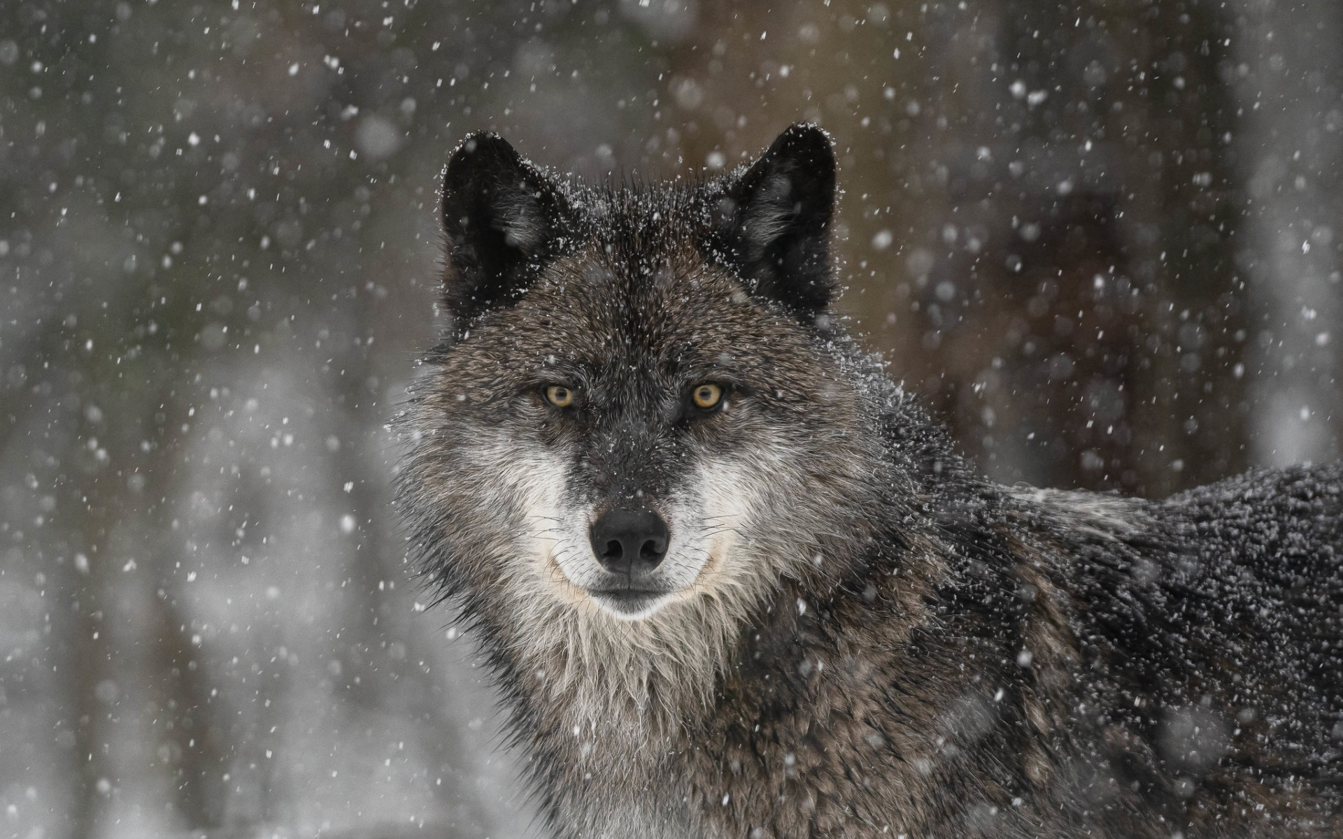 Description: A wolf standing in the snow looking at the camera with a blurry background of trees and snow flakes.