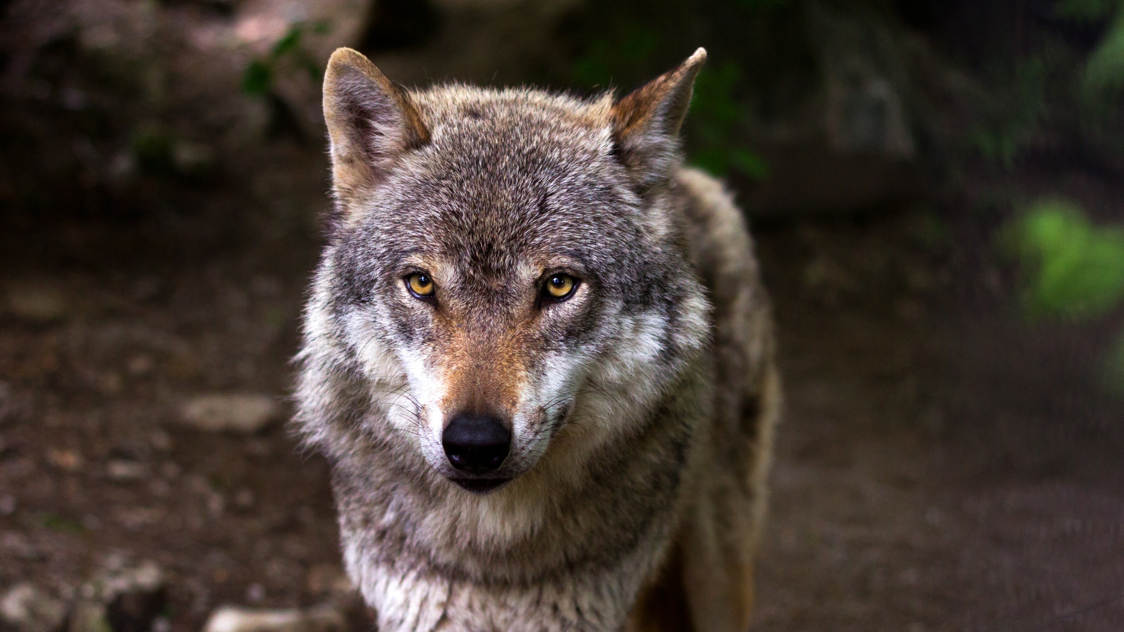 Description: A wolf is walking on a path in the woods with a blurry background of leaves and rocks.