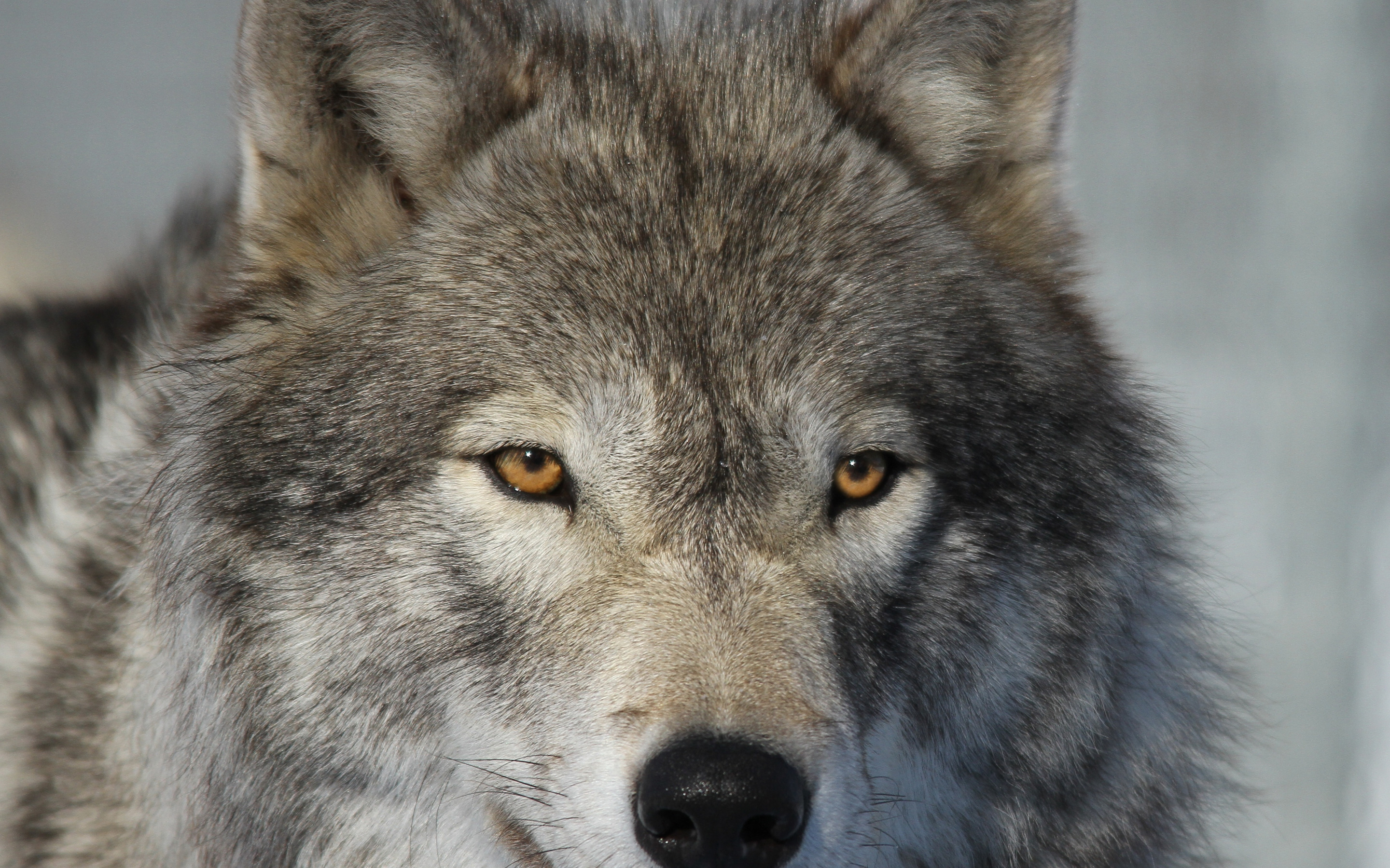 Description: A wolf with a yellow eye staring at the camera with a blurry background of the wolf's face.