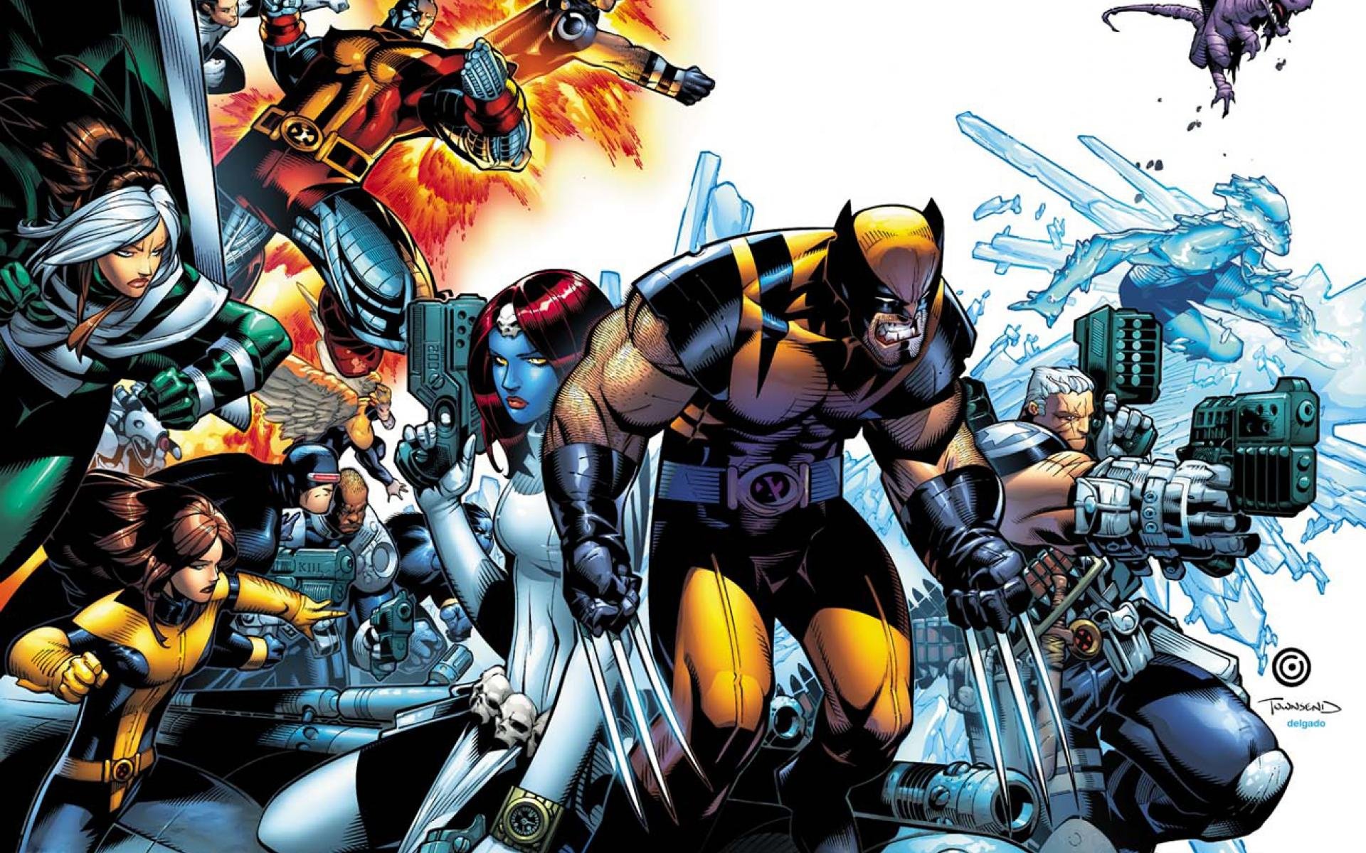 Description: A group of wolverine comics characters in front of a white background with a splash of water and a fire.