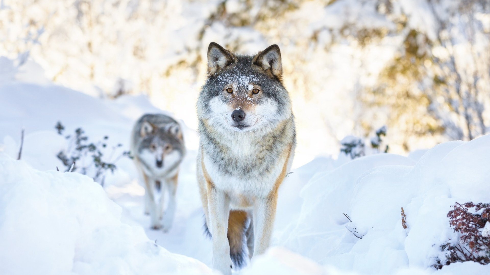 Description: Two wolfs walking in the snow in the woods with trees in the background and snow on the ground.