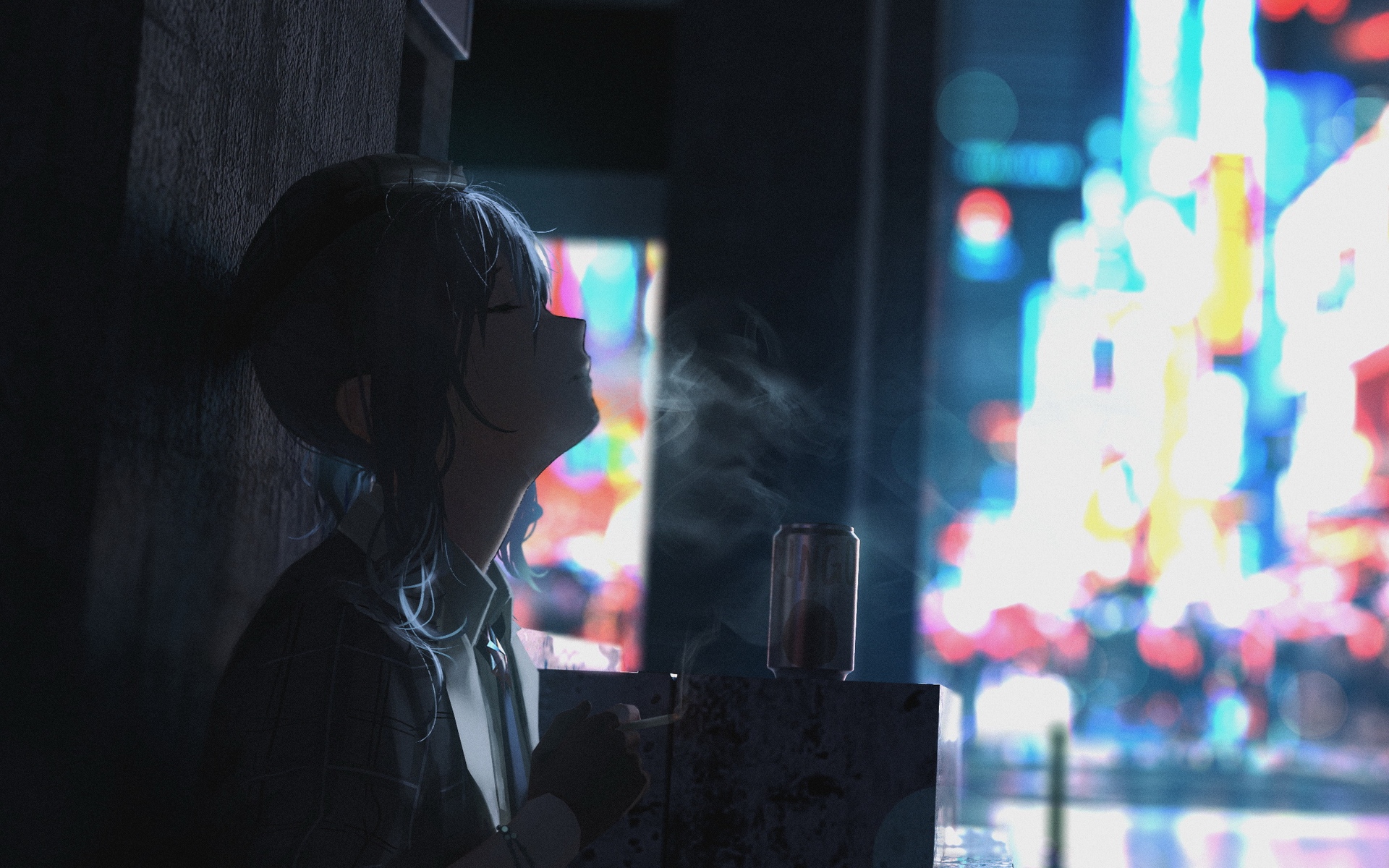Description: A woman standing in a dark alley with a cigarette in her hand and a city in the background at night.
