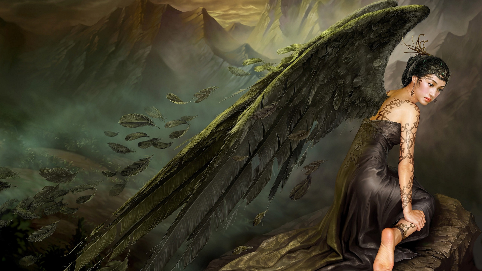 Description: A woman with a tattoo on her arm sitting on a rock with a large black angel wings above her head.