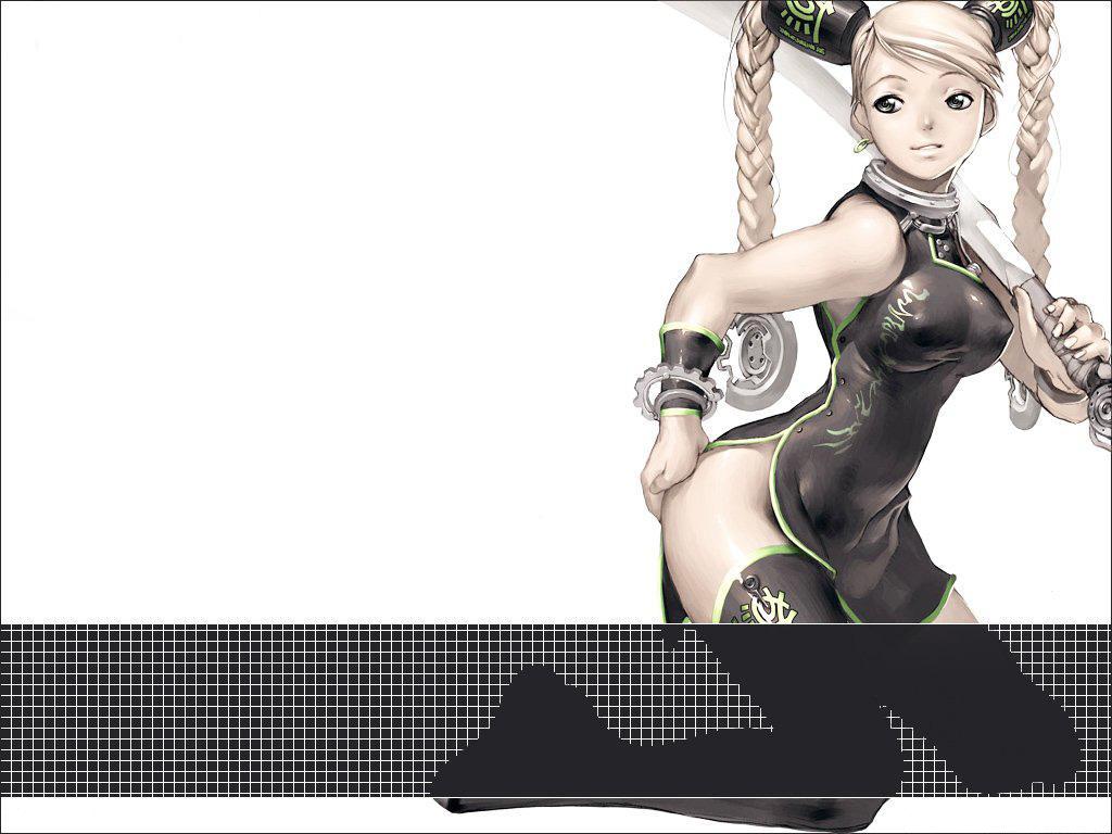 Description: A woman in a black and green outfit holding a sword and a ball chain with a white background behind her.