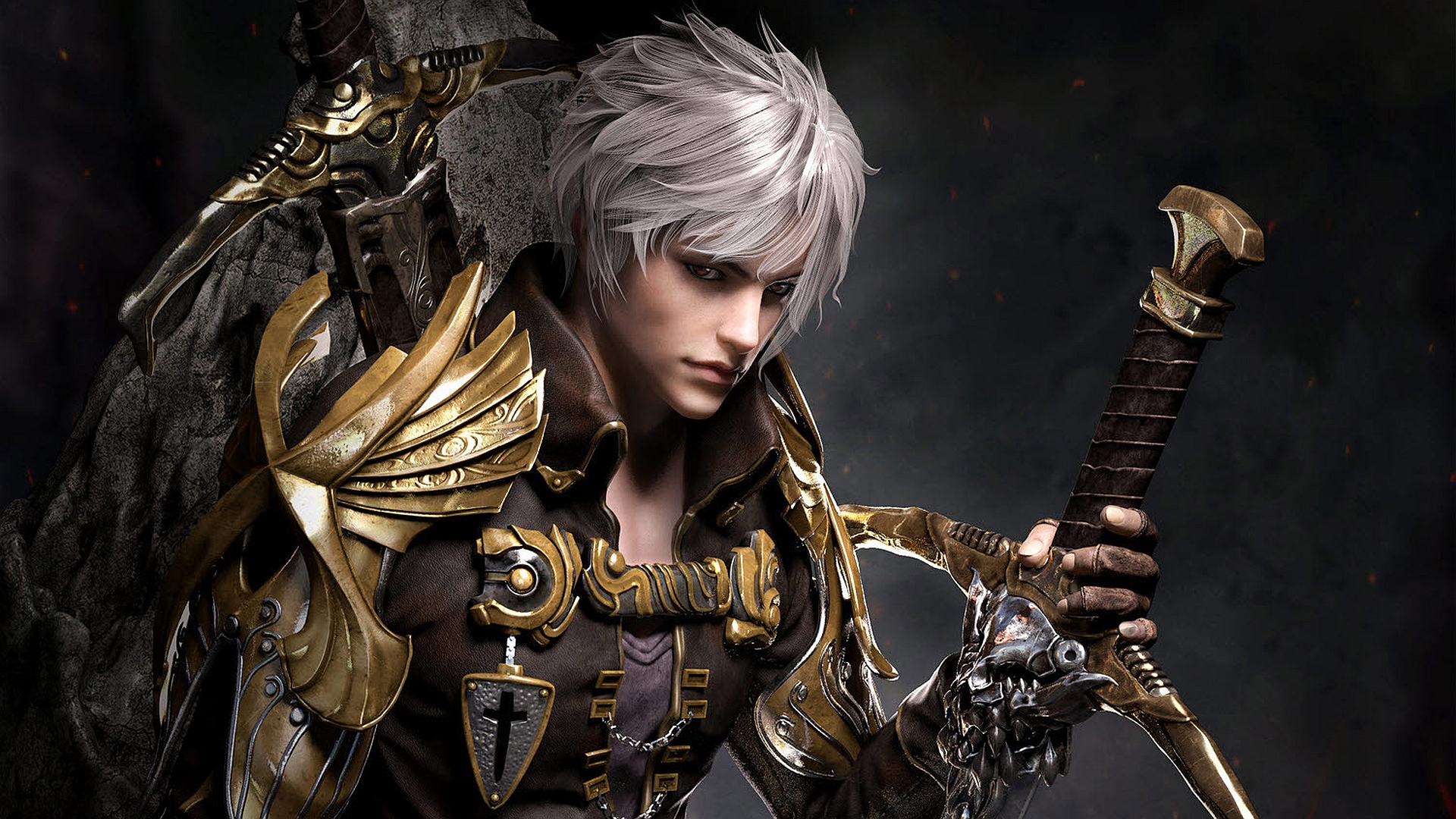 Description: A woman with a sword and armor in a dark background with a demon behind her.