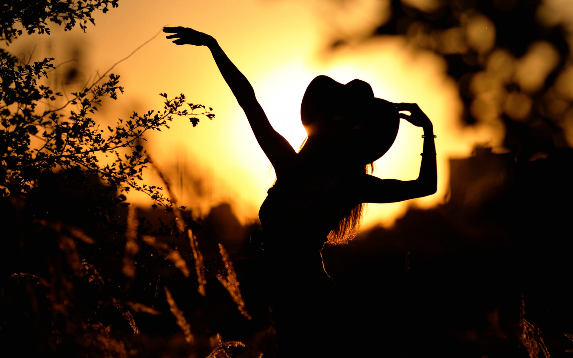 Description: A woman is standing in a field with her arms up in the air and her arms are in the air.