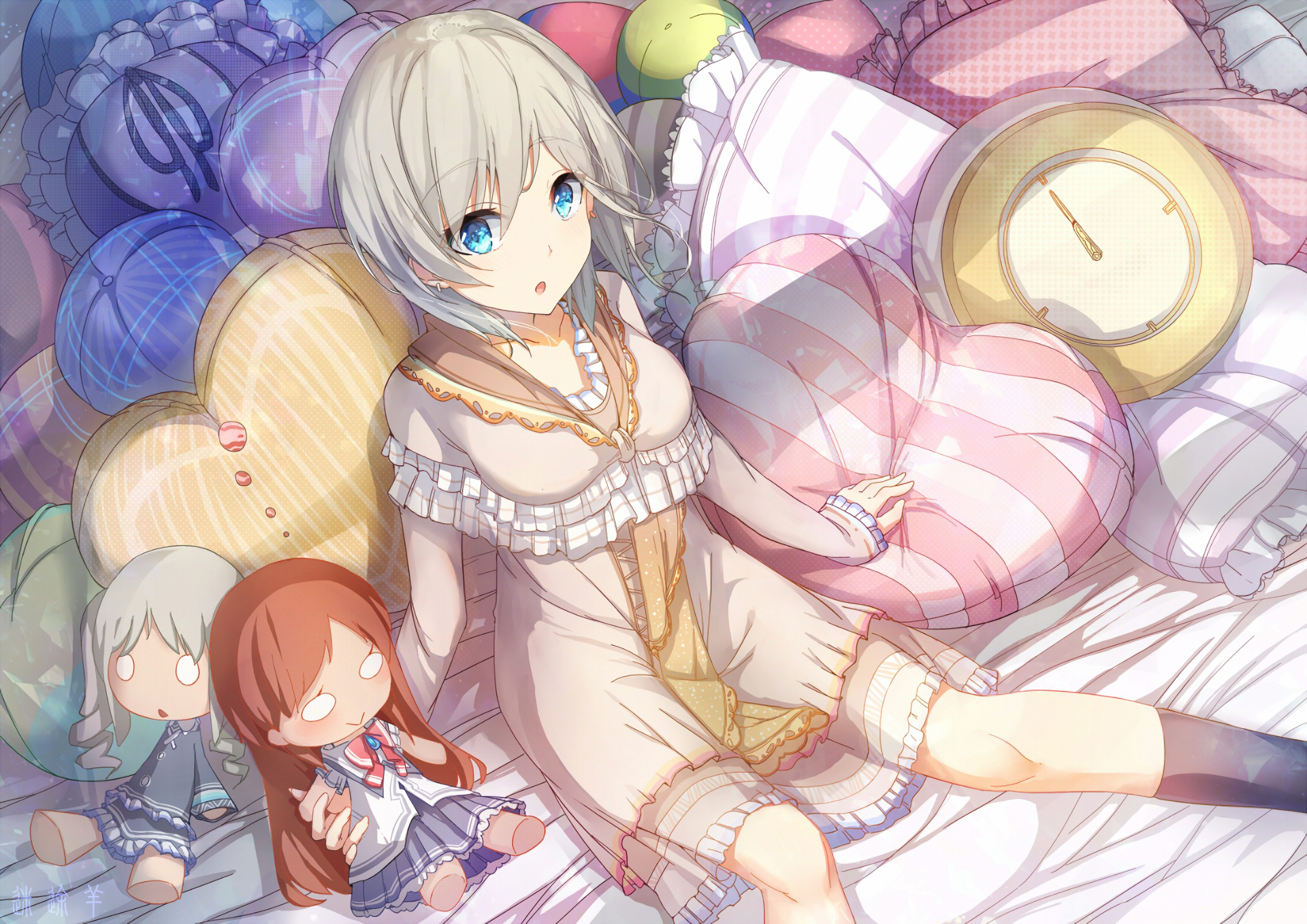 Description: A woman laying on a bed with a bunch of balloons in the background and a clock in the foreground.