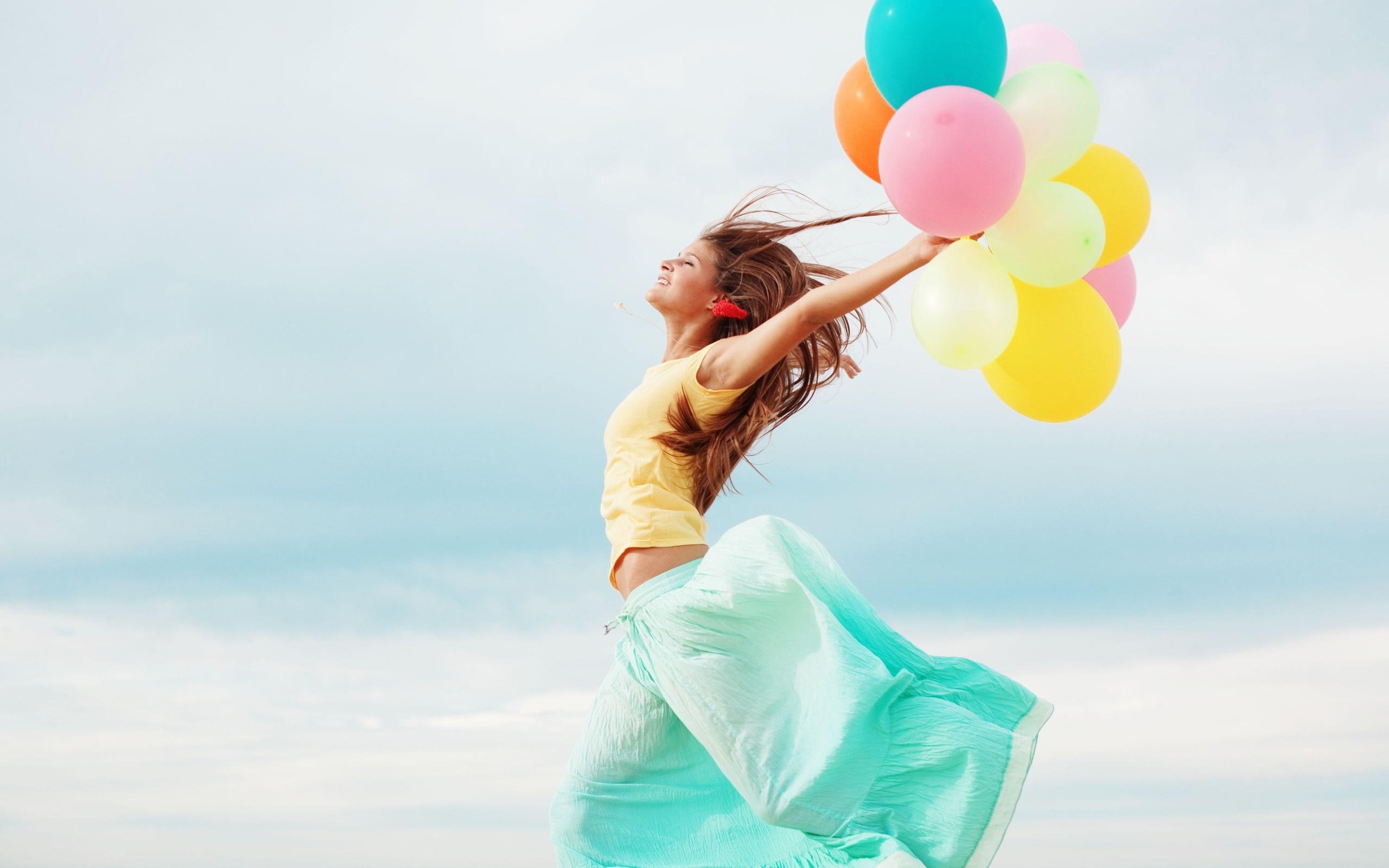 Description: A woman holding a bunch of balloons in her hand and jumping in the air with her arms outstretched in the air.