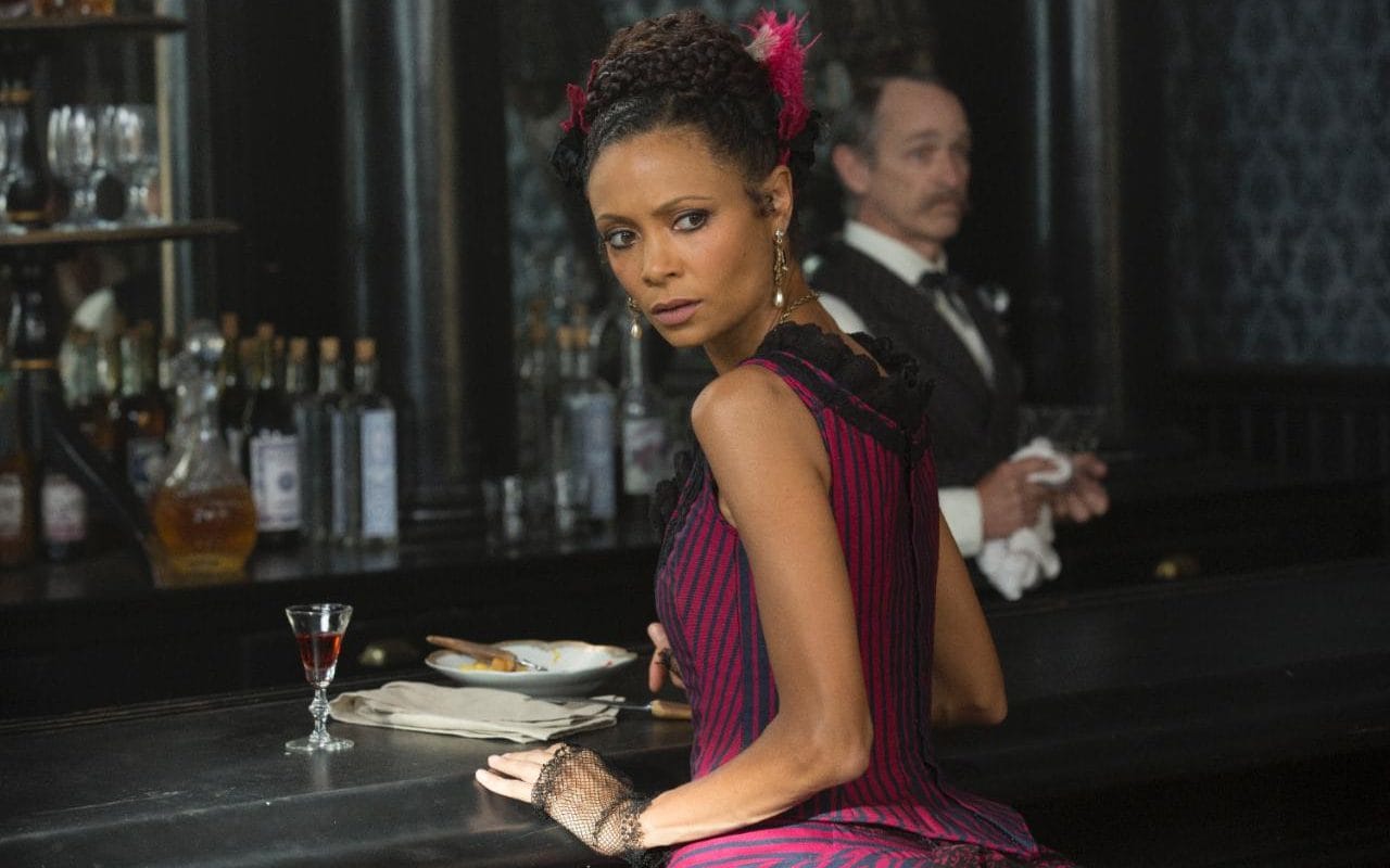 Description: A woman sitting at a bar with a glass of wine in front of her and a man in a suit behind her.