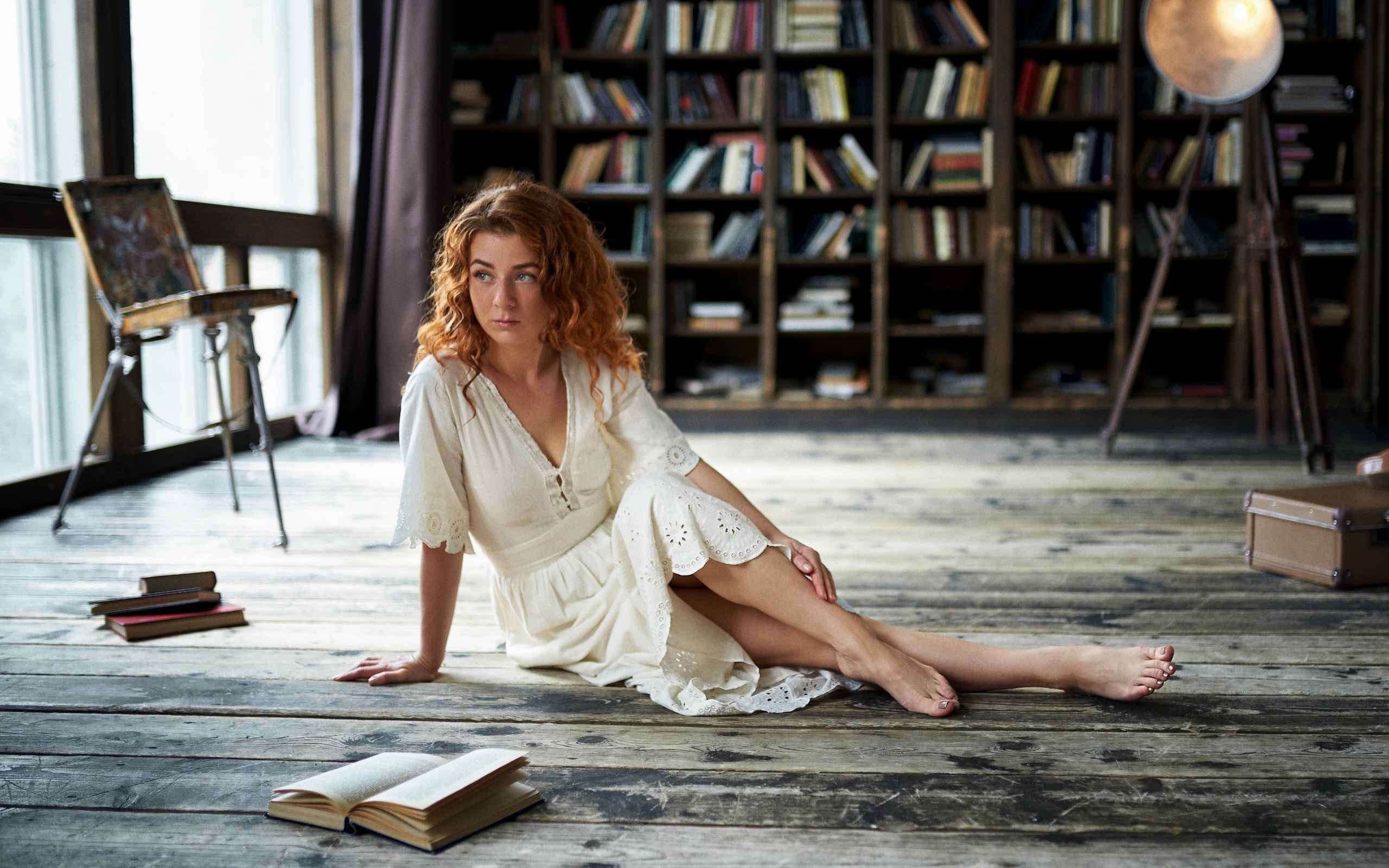 Description: A woman sitting on the floor in front of a bookcase with books on the floor and a lamp.