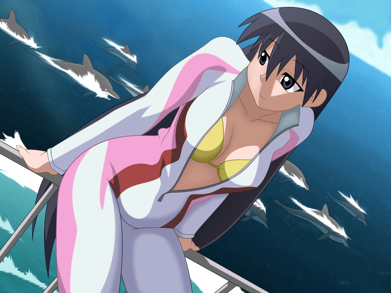 Description: A woman in a bathing suit standing on a boat in the ocean with sharks in the background and a man in a suit standing on a boat.