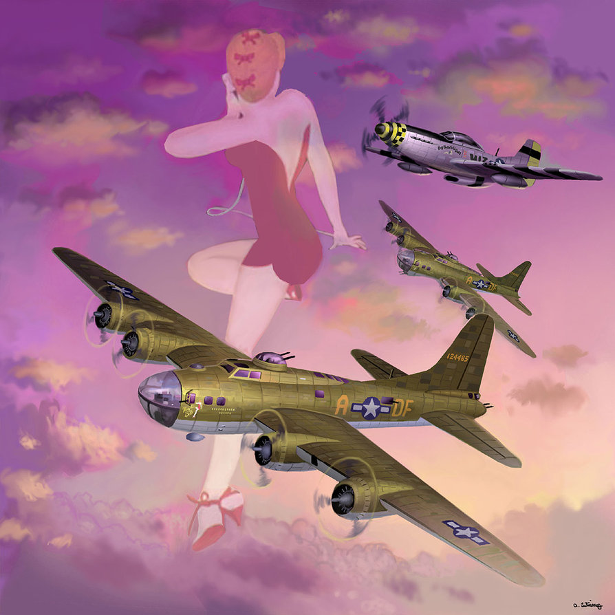 Description: A painting of a woman in a bathing suit flying in the sky with four planes above her and a plane above her.