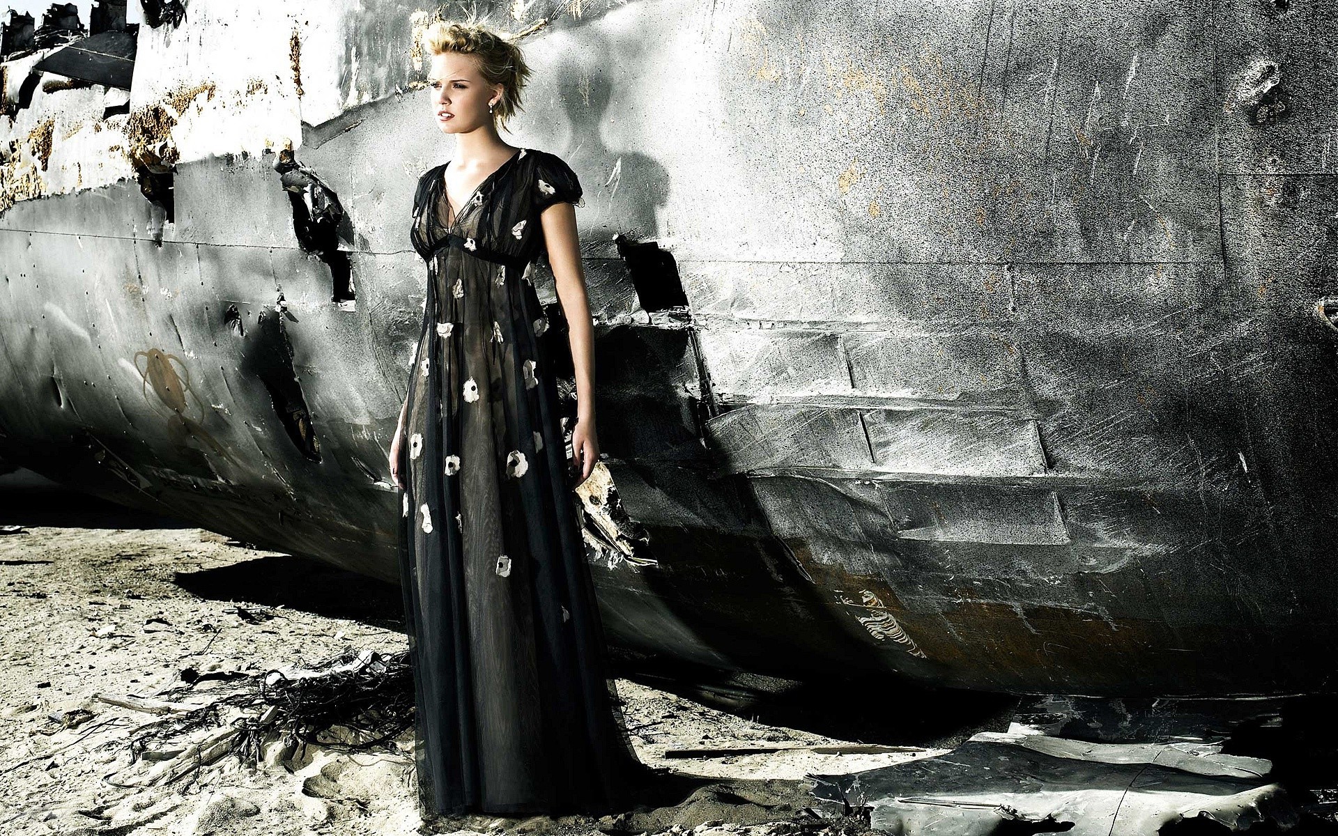 Description: A woman standing in front of a large boat on the beach with a handbag in her hand and a handbag in her other hand.